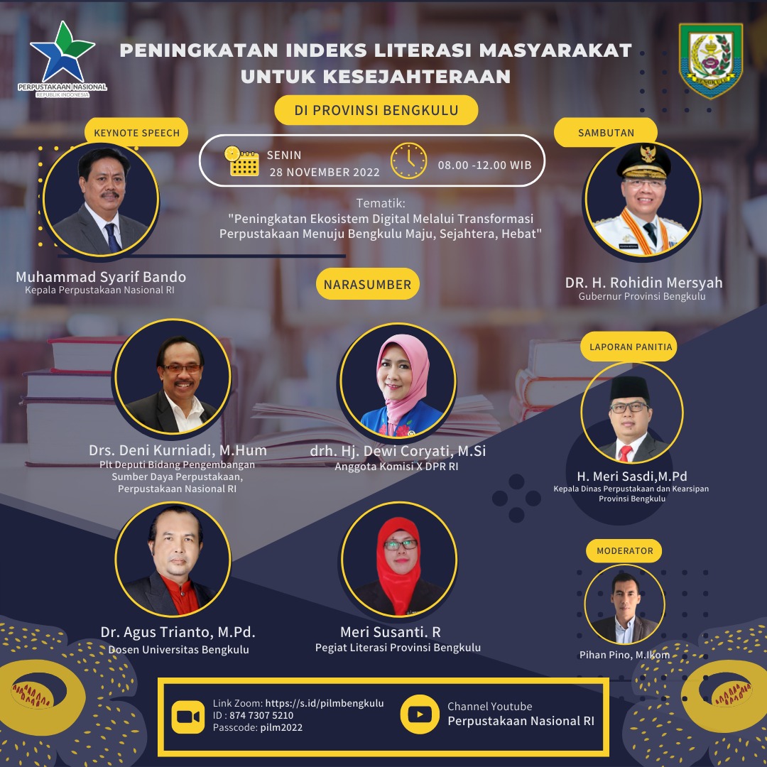 Kepala Dinas Perpustakaan dan Kearsipan Provinsi Bengkulu bapak H. Meri Sasdi, M.Pd mengajak seluruh sahabat Perpusnas yang ada di Provinsi Bengkulu untuk dapat mengikuti acara yang sangat bergengsi ini secara virtual. Dimana kegiatan ini akan berlangsung pada hari Senin tanggal 28 Novembet 2022, mulai dari pukul 08.00 – 12.00 WIB. Dalam acara tersebut akan di hadiri oleh para pembicara yang Profesional dibidangnya, yakni: