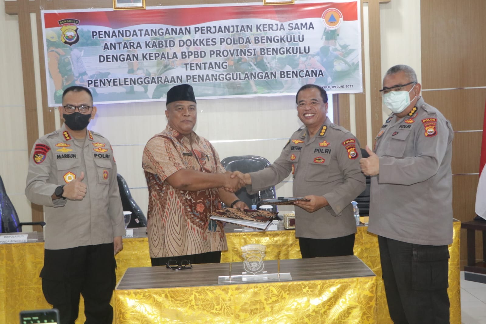 Bengkulu – Kepolisian Daerah Bengkulu melakukan kerjasama bersama BPBD Provinsi Bengkulu. Bentuk kerjasama tersebut tertuang dalam penandatangan perjanjian kerjasama Polda Bengkulu dengan Badan Penanggulangan Bencana Daerah (BPBD) provinsi Bengkulu yang dilaksanakan hari ini di aula Biddokes Polda Bengkulu, Jumat (09/06/2023) tentang penyelenggaraan penanggulangan bencana.