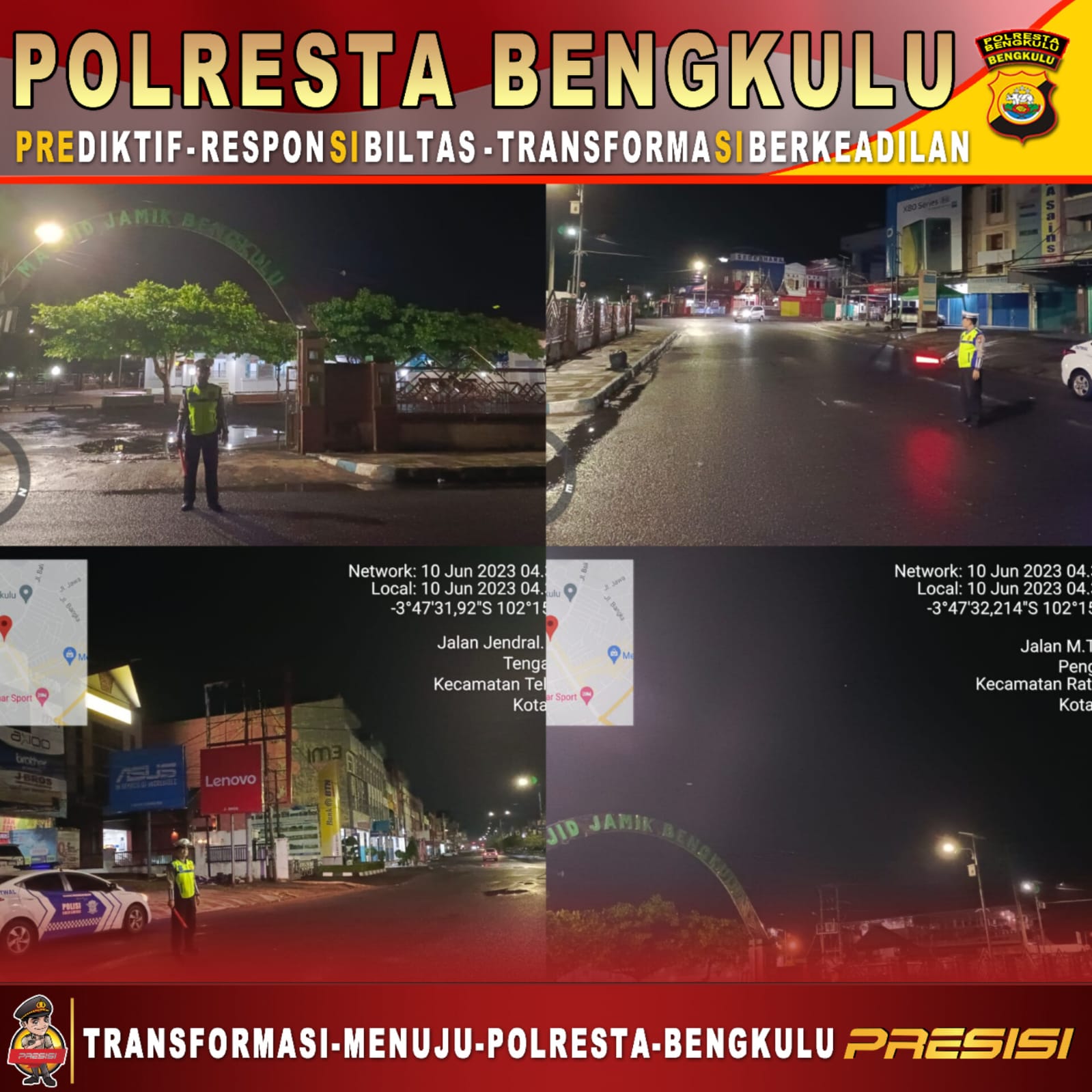 Bengkulu – Personel Satlantas Polresta Bengkulu Polda Bengkulu, melaksanakan patroli subuh di Masjid Jamik Kota Bengkulu, Sabtu (10/6/2023) sekira pukul 04.30 WIB.