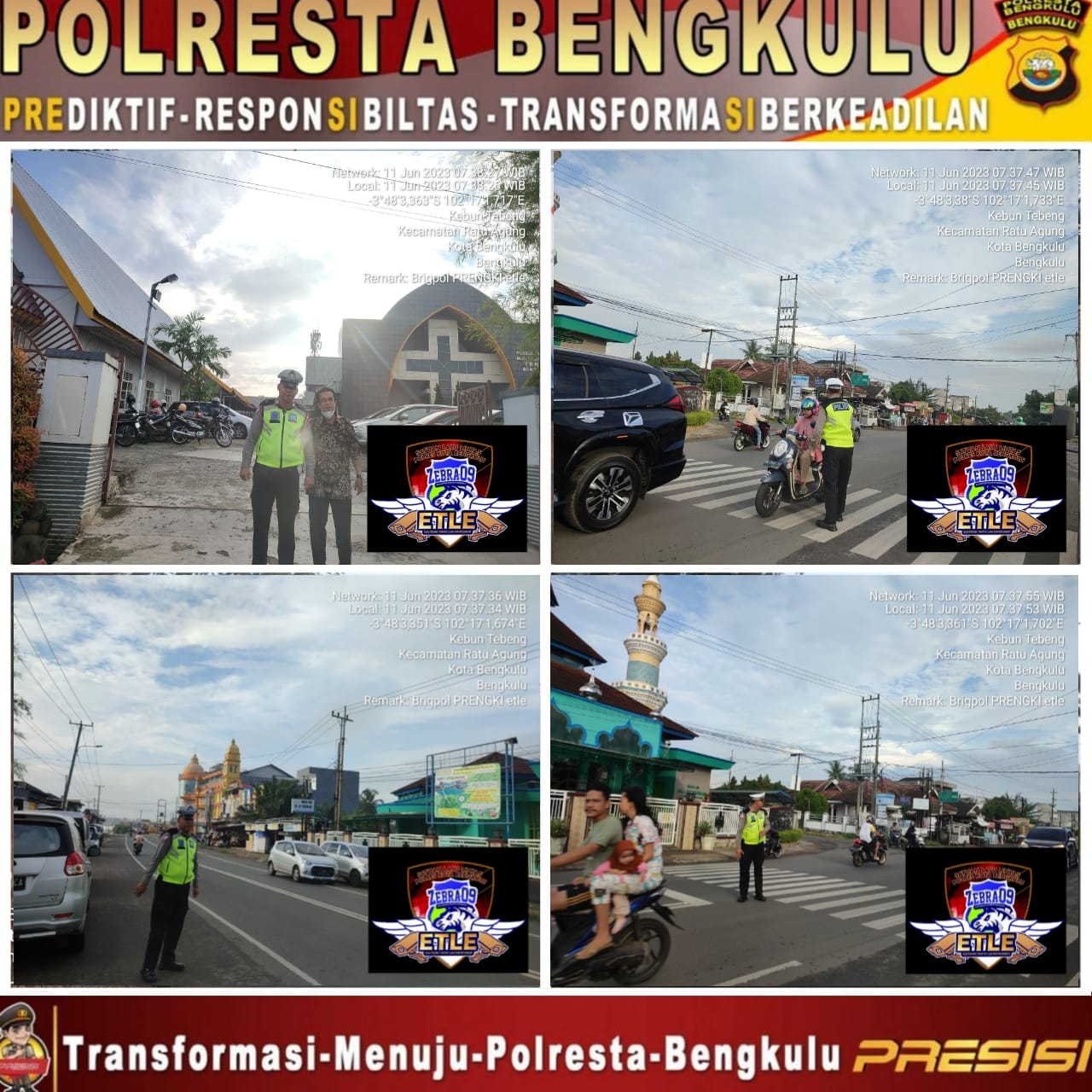 Kota Bengkulu – Untuk menjaga Kamseltibcar tetap lancar dan aman, Personel Sat Lantas Polresta Bengkulu Polda Bengkulu, melaksanakan kegiatan pengamanan lalu lintas ibadah Minggu di Gereja GKII Tebeng Jalan Merapi Raya Kelurahan Kebun Tebeng Kecamatan Ratu Agung Kota Bengkulu, Minggu (11/6/2023).