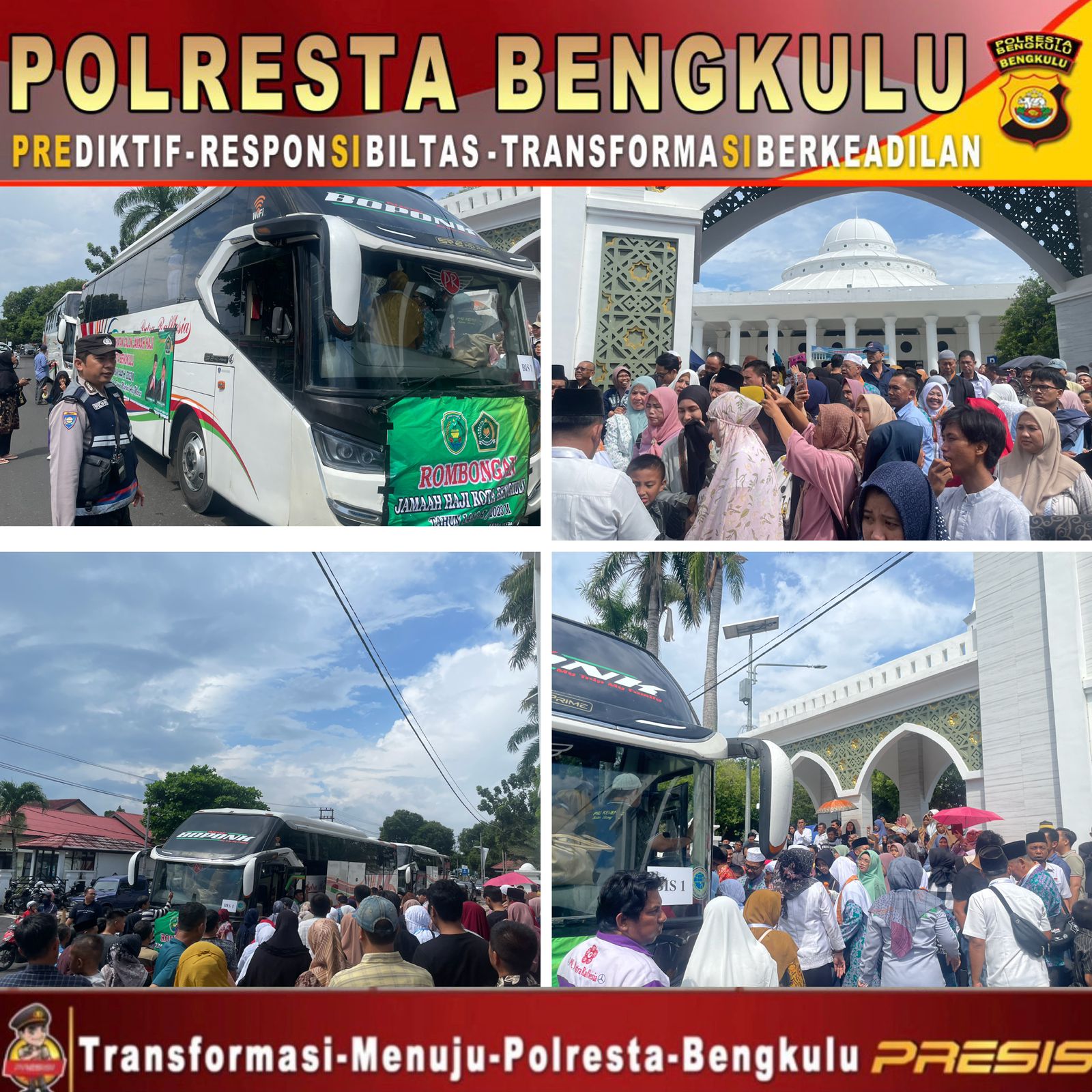 Kota Bengkulu – Upaya Optimalisasi Pelayanan kepada masyarakat serta memberikan rasa aman kepada masyarakat, Personel Satlantas Polresta Bengkulu Polda Bengkulu, laksanakan Pengamanan dan pengawalan keberangkatan Calon Jemaah Haji (CJH) Kota Bengkulu kloter ke 5, di Masjid Agung At Taqwa Kota Bengkulu, Rabu (13/06/2023) Siang.