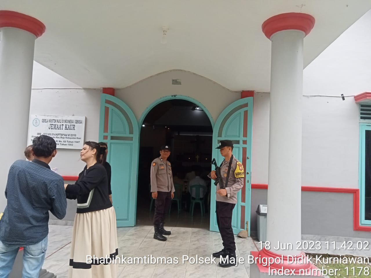 Kaur – Bhabinkamtibmas Polsek Maje Polres Kaur Polda Bengkulu, melaksanakan pengamanan Ibadah Minggu umat kristiani di Gereja-Gereja di wilayah hukum polsek Maje, Minggu (18/06/2023).
