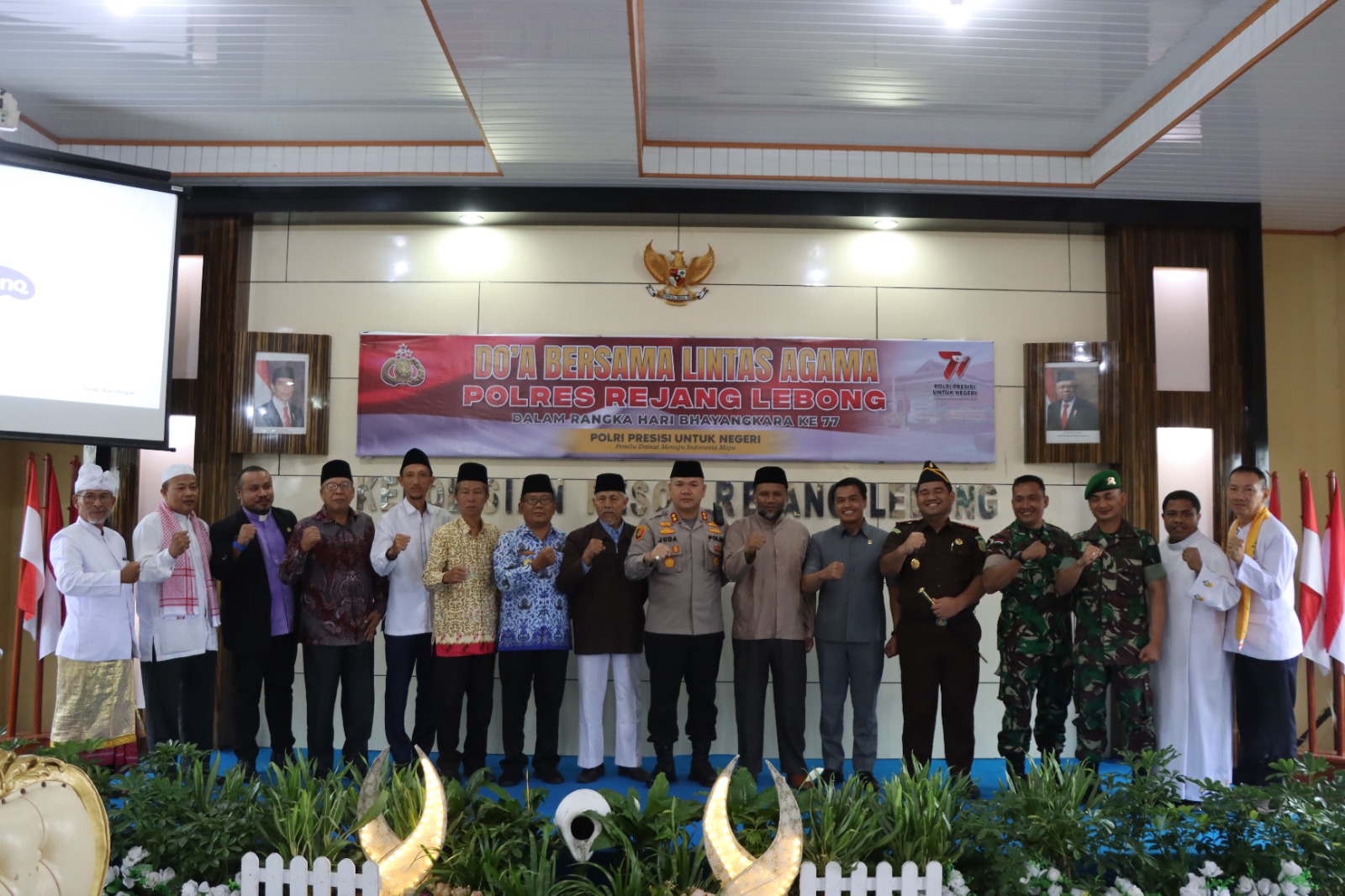 Rejang Lebong – Dalam rangka menyambut HUT Bhayangkara ke-77 tahun 2023 serta menyambut tahun Pemilu Polres Rejang Lebong Polda Bengkulu, melakasanakan Doa bersama lintas agama bersama Forkopimda, FKUB, MUI, dan tokoh Agama di Rejang Lebong, Senin (19/06/2023).