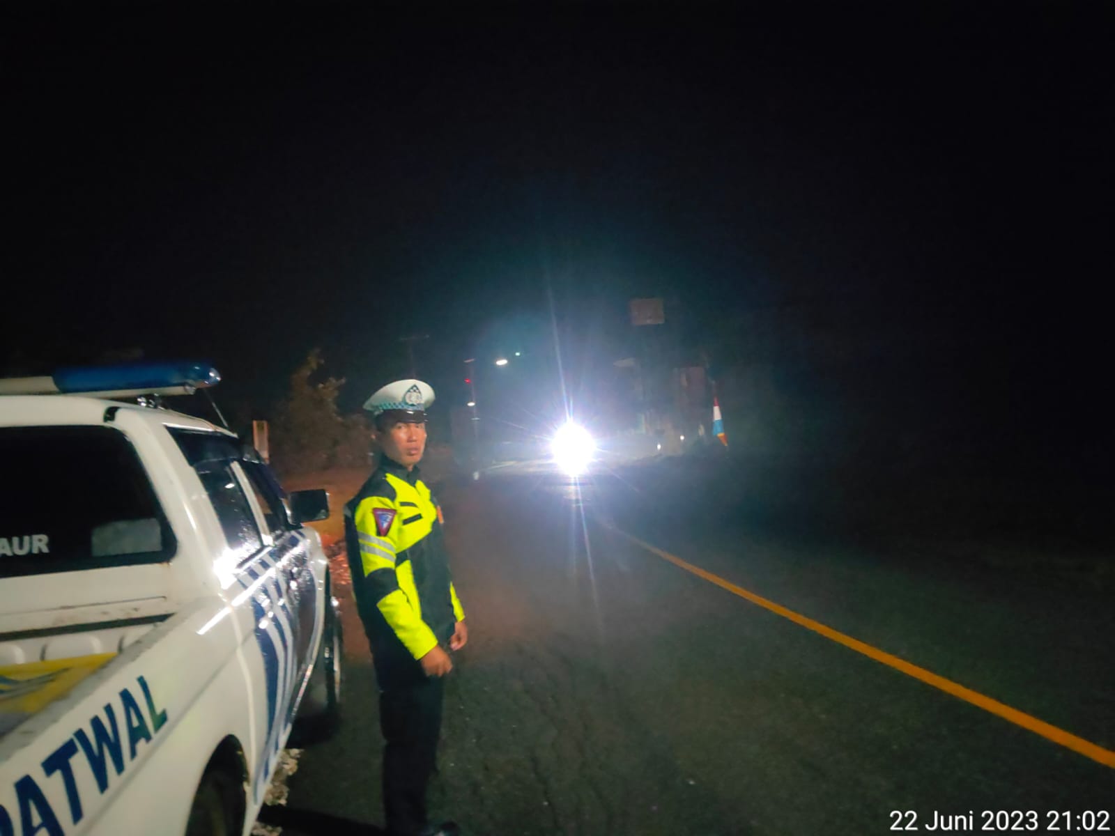 Kaur – Personel Satlantas Polres KaPatroli Blue Light ur Polda Bengkulu, melaksanakan Patroli Blue Light di jalan raya Lintas Sumatera Kota Bintuhan Kabupaten Kaur, Kamis (22/06/2023) malam.