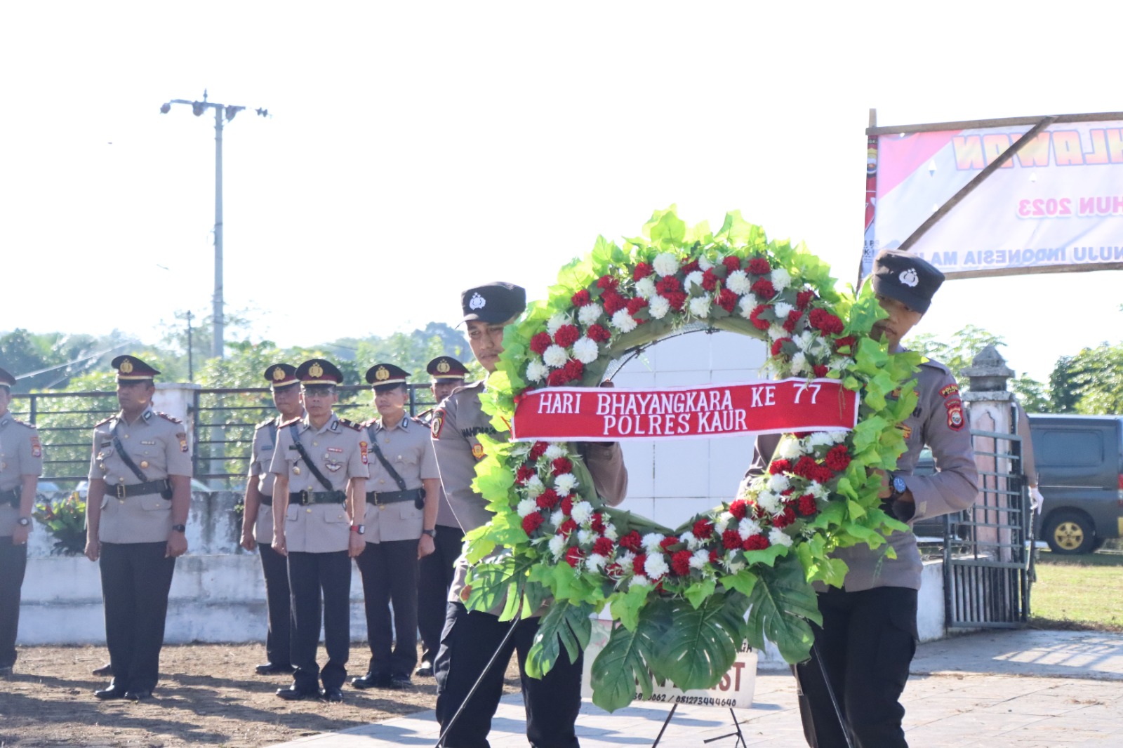 Kaur – Dalam Rangka HUT Bhayangkara Ke – 77 Polri Presisi Untuk Negeri Pemilu Damai Menuju Indonesia Maju. Polres Kaur melaksanakan upacara ziarah makam pahlawan di taman makam pahlawan Padang Kempas desa Masuk Baru kecamatan Tetap kabupaten Kaur, Rabu (28/06/2023).