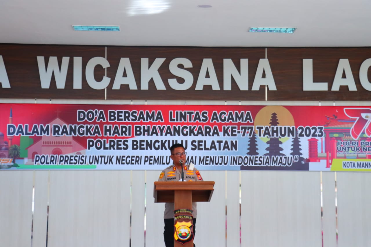 Dalam sambutannya Kapolres Bengkulu Selatan AKBP Florentus Situngkir, menyampaikan bahwa kegiatan doa bersama lintas agama ini terlaksana merupakan rangkaian kegiatan pembinaan tradisi peringatan Hari Bhayangkara ke-77 Tahun 2023
