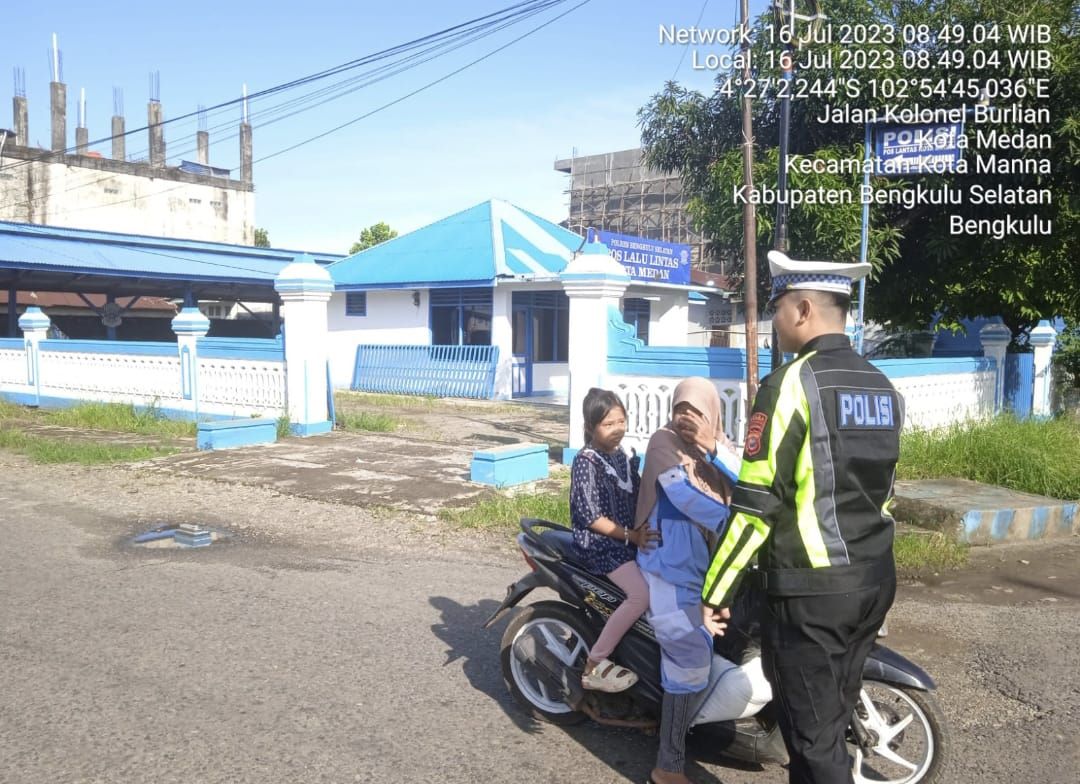 Pada waktu melaksanakan kegiatan teguran simpatik , personel Sat Lantas Polres Bengkulu Selatan Polda Bengkulu Aiptu Iksan bersama personel lainnya sedang melaksanakan kegiatan Operasi Patuh Nala 2023 di seputaran Jalan Kolonel Berlian Kecamatan Kota Manna Kabupaten Bengkulu Selatan mendapati seorang warga yang mengendarai sepeda motor dengan tidak menggunakan helm dan diberikan teguran simpatik.