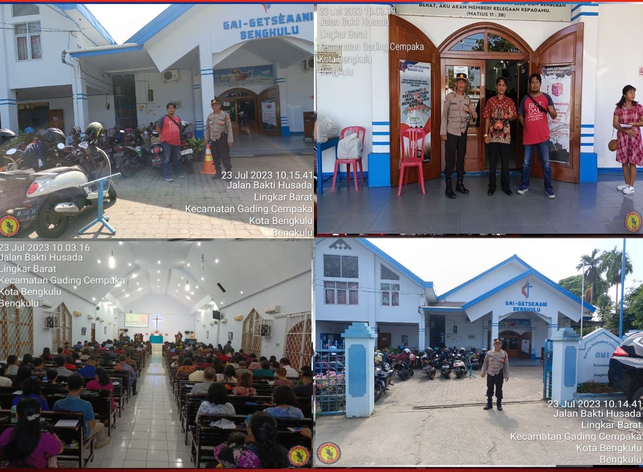 Bengkulu – Polsek Gading Cempaka Polresta Bengkulu Polda Bengkulu, melaksanakan kegiatan rutin yaitu Pengamanan di Gereja yang ada wilayah Kecamtan Gading Cempaka Kota Bengkulu, Minggu (23/07/2023).