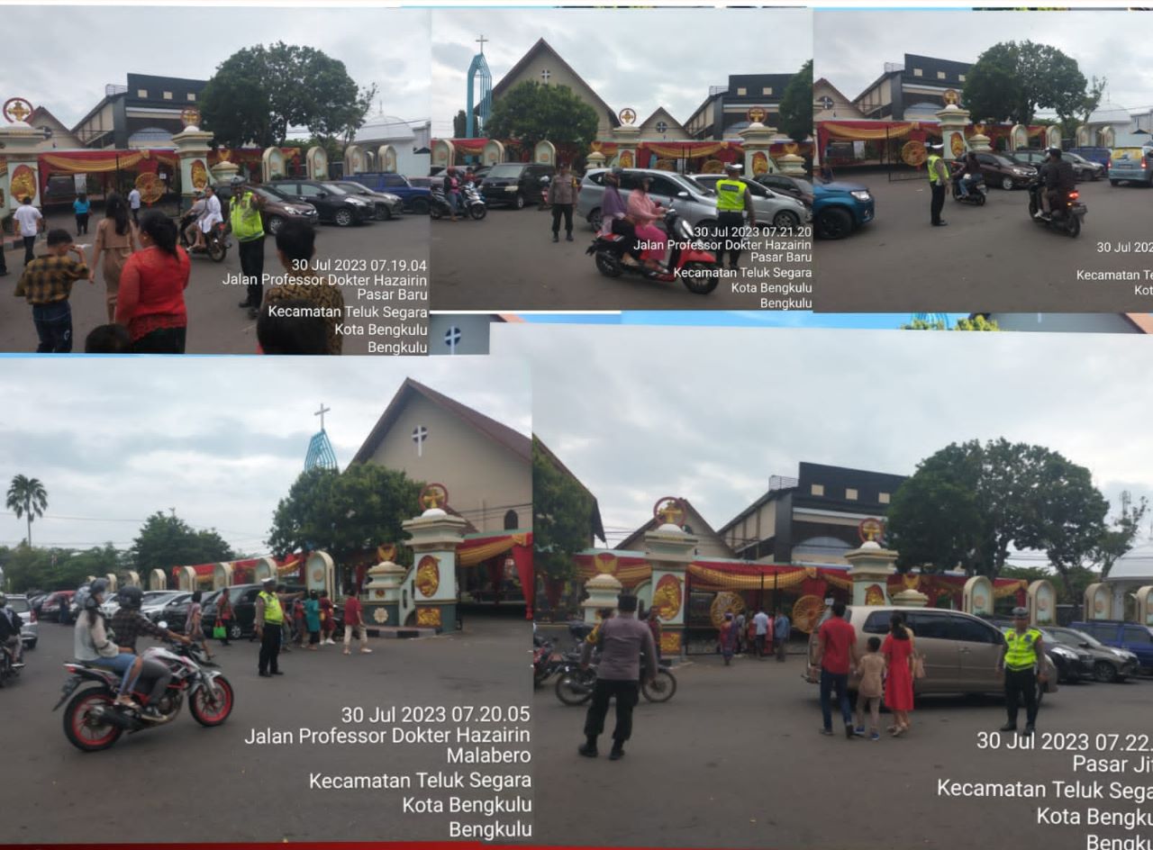 Bengkulu – Sat Lantas Polresta Bengkulu Polda Bengkulu, melakukan pengamanan dan pengaturan Lalu Lintas ibadah Misa di jalan Prof. Dr Hazairin depan Gereja St Yohanes Penginjil Bengkulu, Minggu (30/07/2023) jam 08.30 WIB sd Selesi..