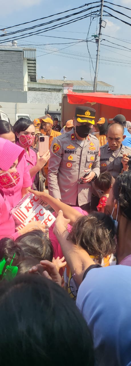 JAKARTA – Ibu-ibu Kemala Bhayangkari dan cabang Polsek Metro Penjaringan serta Polres Jakarta Utara menyambangi lokasi penampungan pengungsi korban kebakaran di Jl. Kapuk Utara I Rt.001/003, Kel. Kapuk Muara, Kec. Penjaringan, Jakarta Utara, Senin (31/7/2023) siang