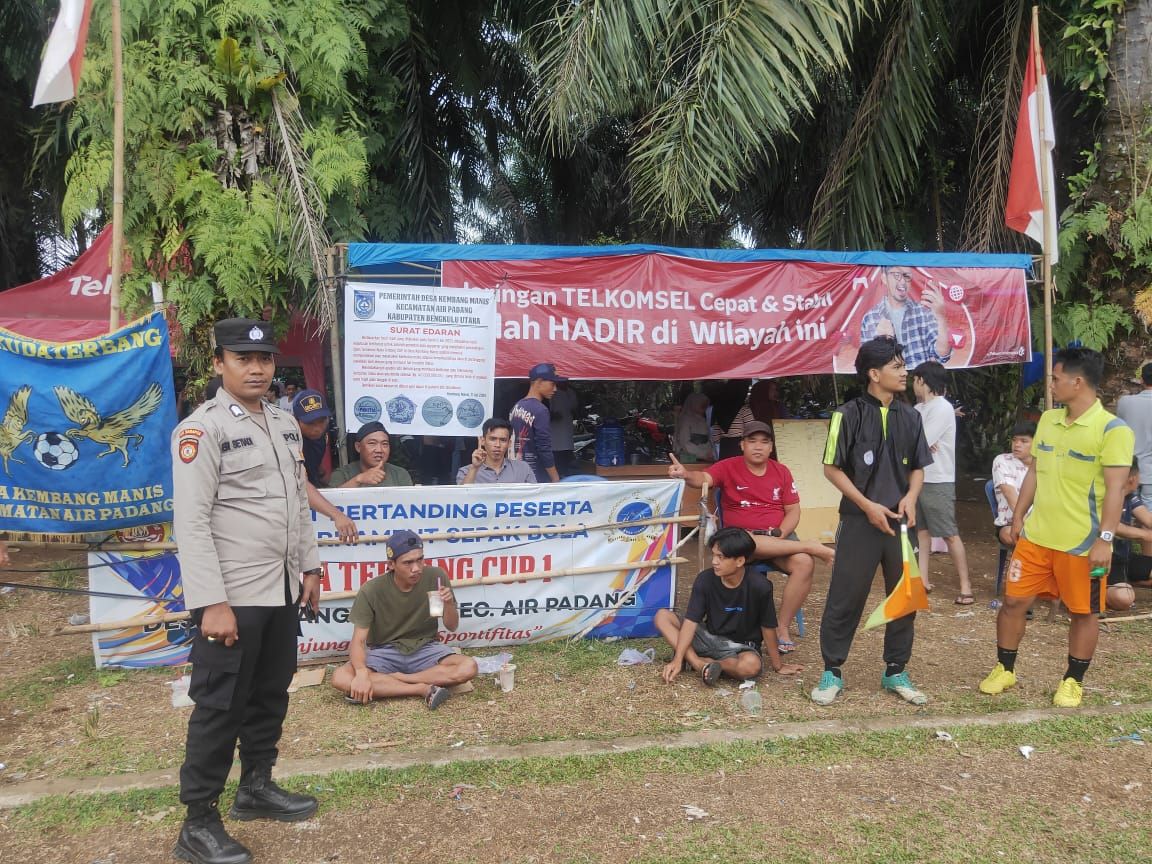 Bengkulu Utara – Laksanakan monitoring dan pengamanan pertandingan sepakbola turnamen Kuda Terbang I, personel Polsek Lais hadir di lapangan pertandingan pada hari Jumat (4/8/2023) sore.
