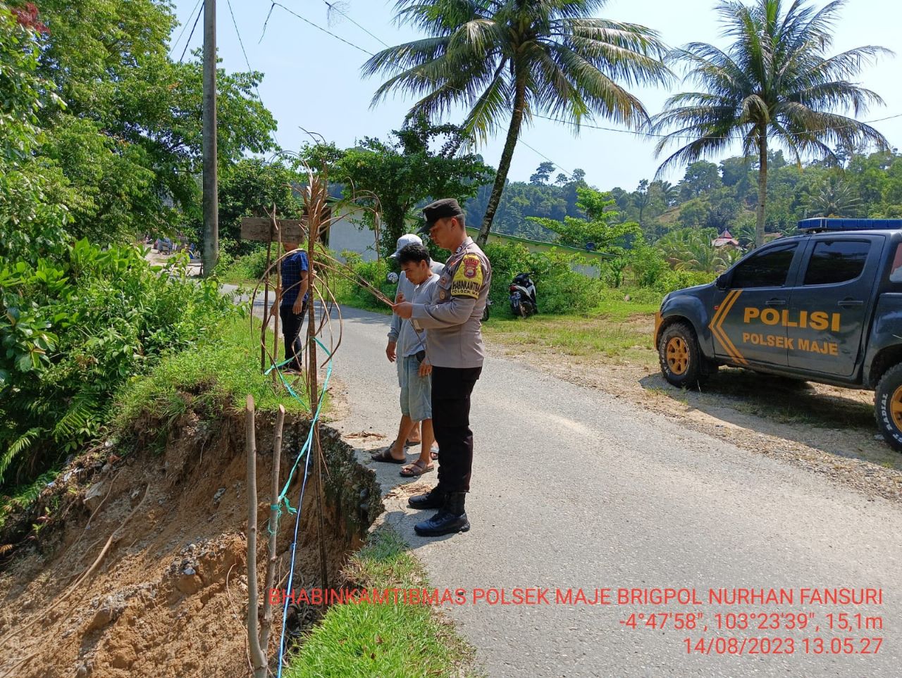 Kaur – Bhabinkamtibmas Polsek Maje Polres Kaur Polda Bengkulu, Brigpol Nurhan Pansuri Pada hari Senin, (14/08/2023) sekira Pukul 11.30 WIB, melaksanakan Giat Monitoring lokasi Longsor di Desa Air Jelatang Kecamatan Maje Kabupaten Kaur.