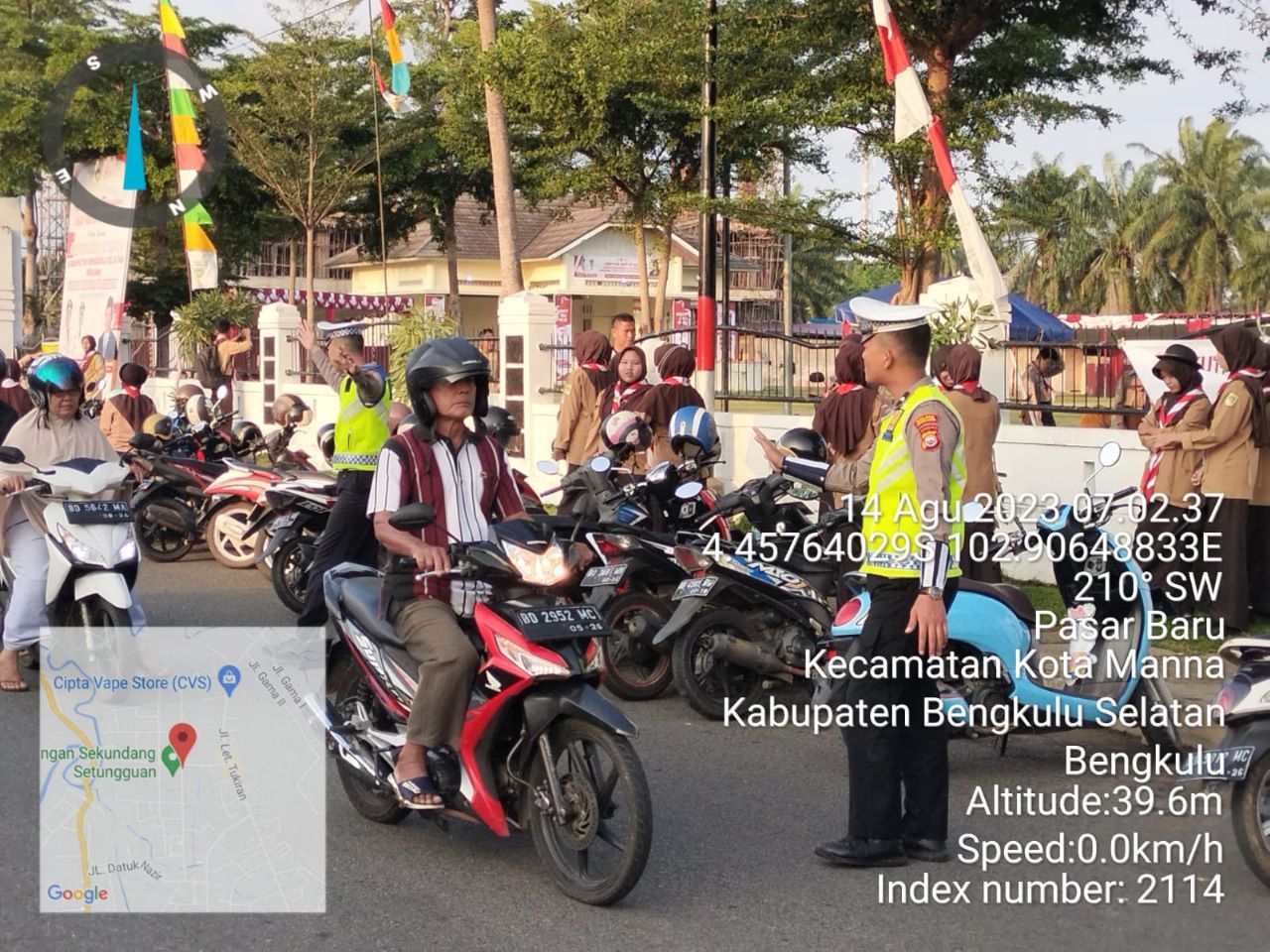 Bengkulu Selatan – Sat Lantas Polres Bengkulu Selatan dan Polsek Kota Manna Polda Bengkulu hadir dalam pengamanan, Pengawalan dan pengaturan lalu lintas kegiatan upacara dalam rangka HUT Pramuka ke 62, pada hari Senin (14/08/23).