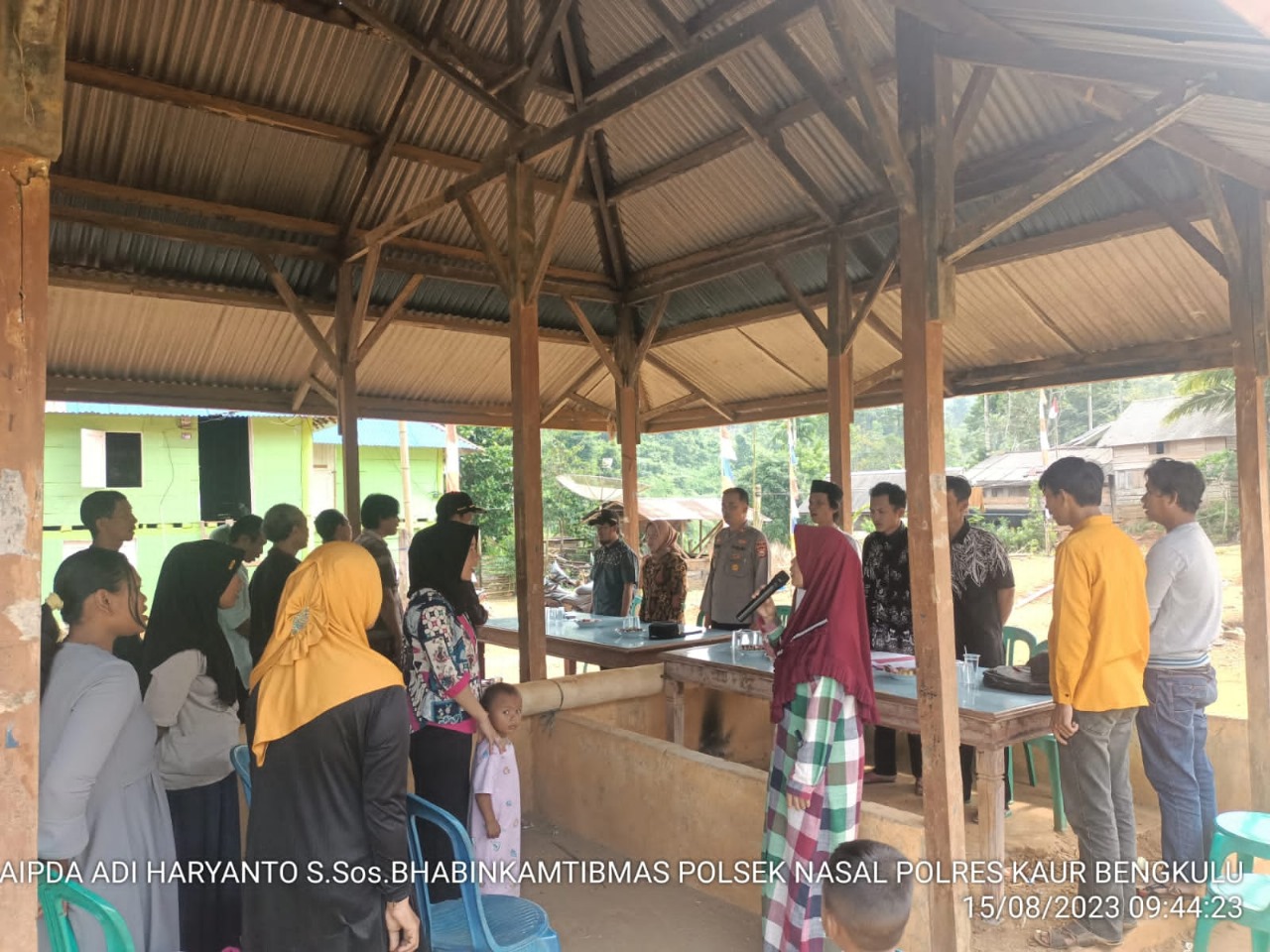 Kaur – Kapolsek Nasal Polres Kaur Polda Bengkulu AKP Pedi Setiawan, S.H.,M.H., mengikuti kegiatan rapat penetapan Bakal Calon Kepala Desa Menjadi Calon Kepala Desa dan kegiatan pencabutan undian nomor urut calon kepala Desa Pasar Jumat Kecamatan Nasal Kabupaten Kaur dalam rangka tahapan Pilkades Serentak Tahun 2023 Kabupaten Kaur.