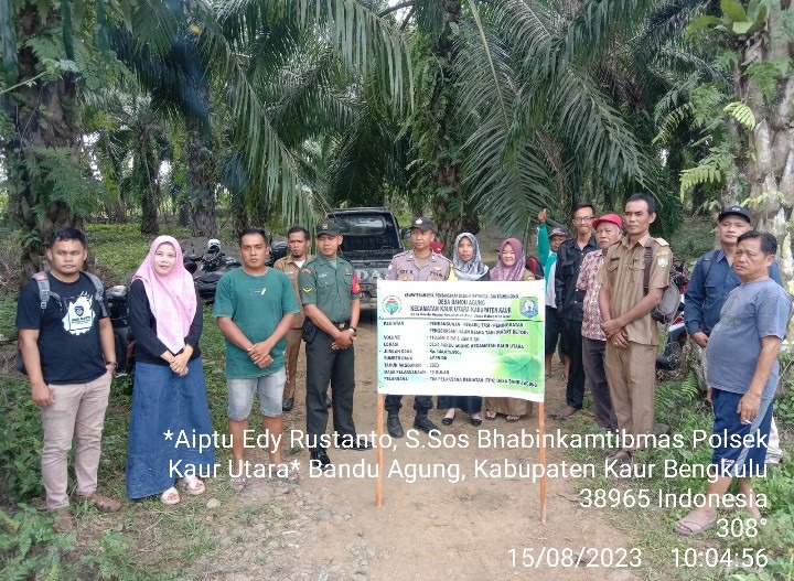 Kaur -Bhabinkamtibmas Polsek Kaur Utara Polres Kaur Polda Bengkulu Aiptu Edy Rustanto, melaksanakan monitoring titik nol pembangunan, rehabilitasi dan peningkatan jalan usaha tani ( Rabat Beton) di Desa Bandu Agung Kecamatan Kaur Utara Kabupaten Kaur, Selasa (15/08/2023) sekira 10.00 WIB.
