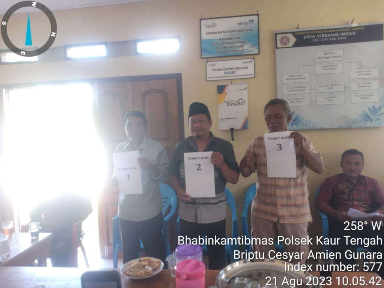 Kaur – Personel Polsek Kaur Tengah Polda Bengkulu, melaksankan pengamanan dan monitoring kegiatan penetapan Calon Kades (Cakades) dan pengundian Nomor urut di balai Desa Serdang Indah Kecamatan Luas Kabupaten Kaur, Senin (21/08/2023).