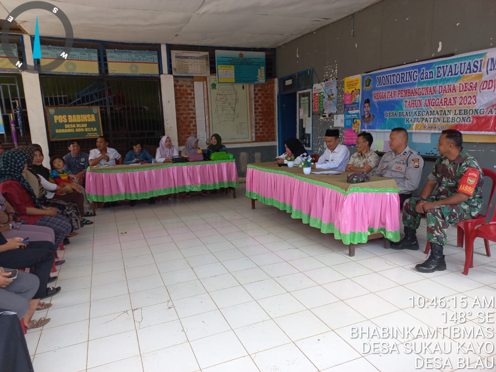 Lebong – Kanit Binmas Polsek Lebong Atas dan Bhabinkamtibmas Bripka Kabiono, menghadiri kegiatan Monev DD tahun 2023 di Desa Blau, Rabu (13/9/2023).