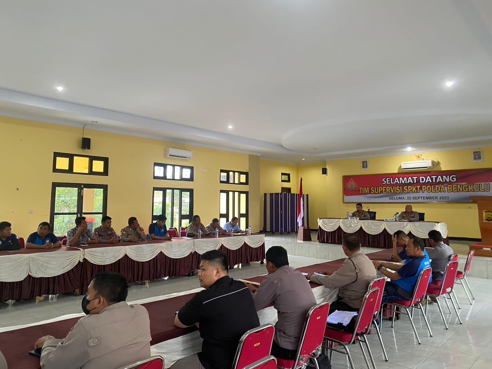 Seluma – Tim dari Polda Bengkulu yang dipimpin Kompol Sugeng HP, didampingi AKP Yanto, Aipda Hendri dan Aipda M Widodo, melaksanakan supervisi SPKT di Polres Seluma, bertempat di Aula Endra Dharmalaksana Polres Seluma, Jumat (22/9/2023).