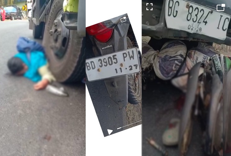 Diketahui, korban Rina nampak terpental nyangkut di ban truk kiri belakang.
