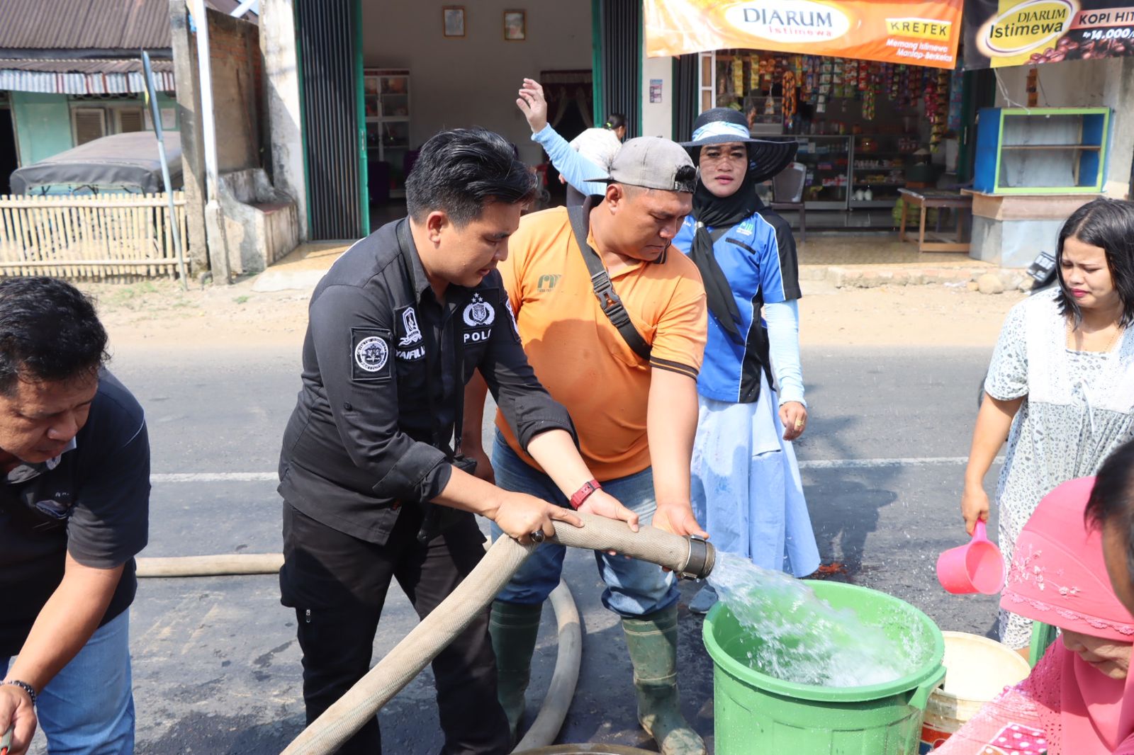 Penyaluran air bersih ini melibatkan personel Humas Polres Lebong dan Sat Samapta Polres Lebong.