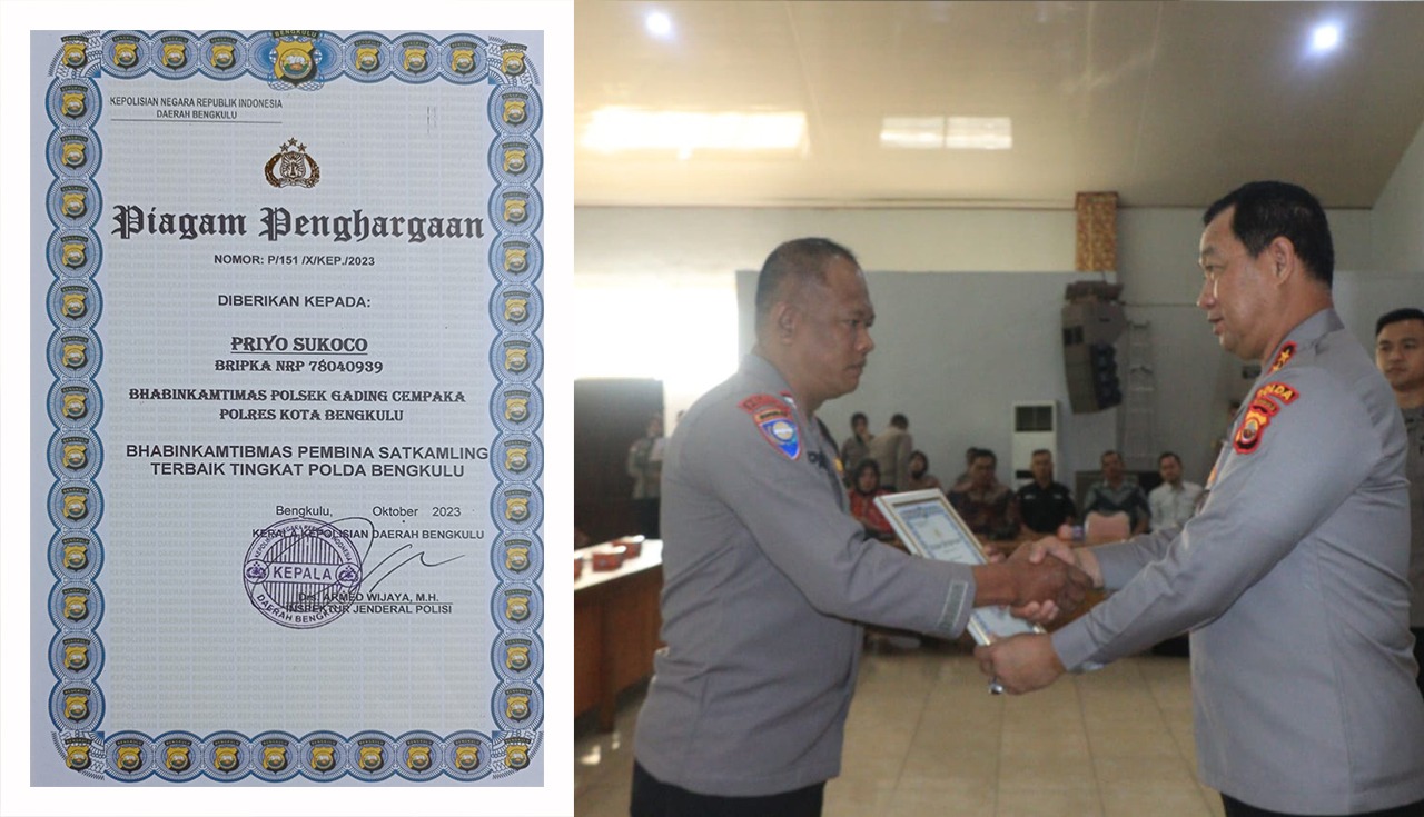 Bengkulu – Bhabinkamtibmas Polsek Gading Cempaka Polres Kota Bengkulu Bripka Priyo Sukoco, meraih penghargaan sebagai Bhabinkamtibmas Pembina Satkamling Terbaik Tingkat Polda Bengkulu.