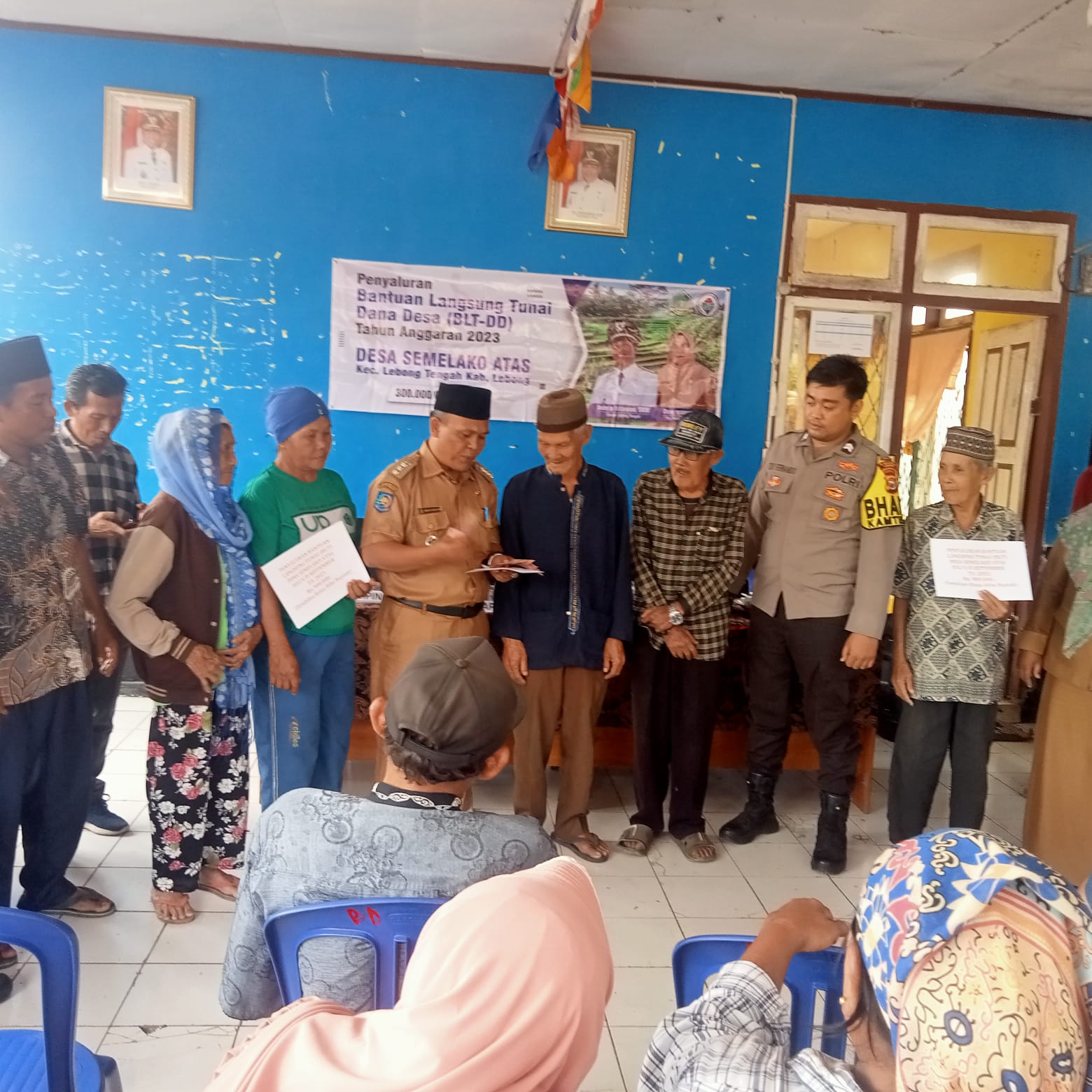 Lebong – Bhabinkamtibmas Polsek Lebong Tengah Polres Lebong Polda Bengkulu, Briptu Edo Fernando, menghadiri penyaluran BLT DD Tahap III Desa Semelako Atas, Kecamatan Lebong Tengah Kabupaten Lebong, Selasa (31/10/2023).