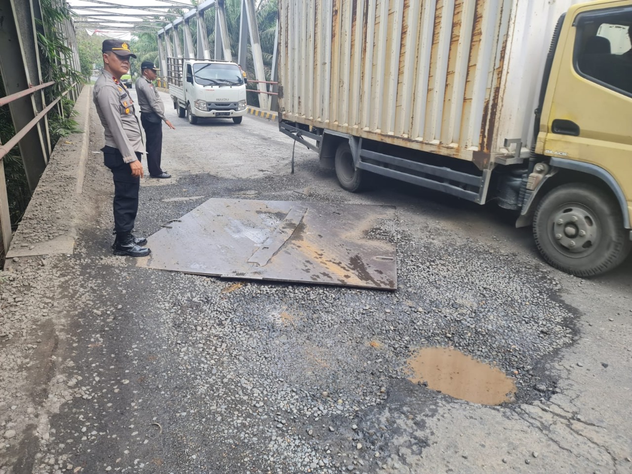 Bengkulu Utara – Kapolsek Batiknau beserta Babinkamtibmas melakukan pengecekan Jembatan yang menghubungkan antar Provinsi yang sudah melai putus parah, Rabu (01/10/2023). Rusaknya jembatan ini sudah berlangsung lama dan parah, namun selau di antisipasi dengan menimbun matral dan di kasih plat, dan sekarang ini jembatan tersebut sudah rusak parah. Hasil pemantauan dilapangan, penyebab rusaknya jembatan tersebut disebabkan oleh banyaknya mobil bermuatan yang melintas akirnya pada ujung jembatan di sisi sebelah desa Paninjau mengalami rusak parah dan juga karena usia jembatan yang sudah relatif tua. Ipda Deni Mashuri, S.H., menambahkan bahwa tindakan yang telah dilaksanakan oleh pihaknya antara lain, telah menghimbau untuk selalu berhati hati pada titik lokasi rusaknya jembatan di karenakan mobil yang melintas selalu mengambil lanjut kiri. “Mudah-mudahan jembatan ini segera diperbaiki, karena jembatan ini adalah penghubung antar desa dan antar provinsi,” demikian tutup Ipda Deni Mashuri, S.H.