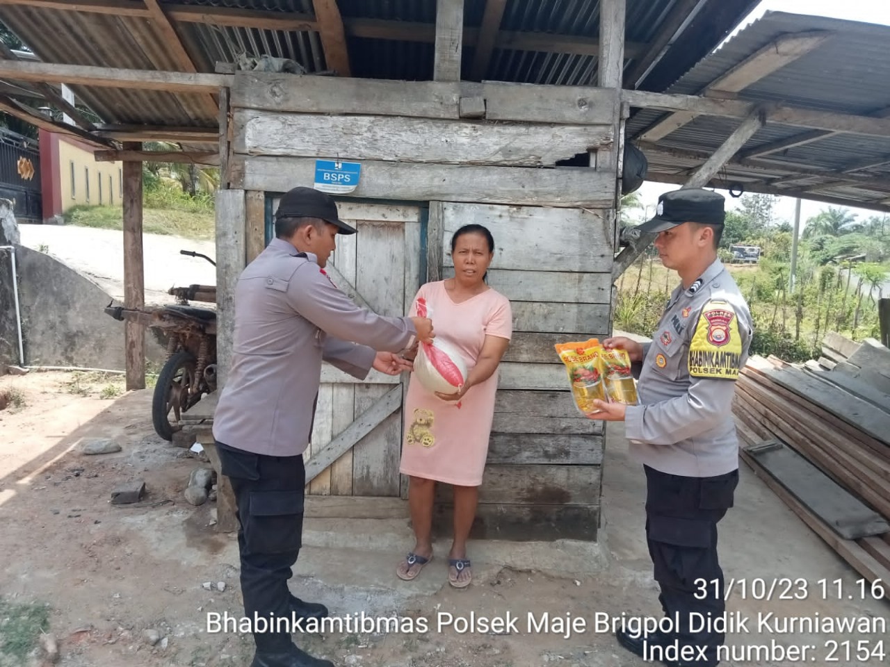 Dalam kegiatan Selasa berbagi ini Personel polsek Maje Aiptu Wahyu Handoko. SH, Aiptu Y.A.Zega, Bripka Saut M Tinambunan SH, Brigpol Didik Kurniawan, dan Brigpol Nurhan Pansori, memberikan sembako berupa beras 5 Kg dan Minyak Goreng 2Kg kepada Sarimauli Br Marbun (50) warga Desa Suka Pardasuka Kecamatan Maje kabupaten Kaur.