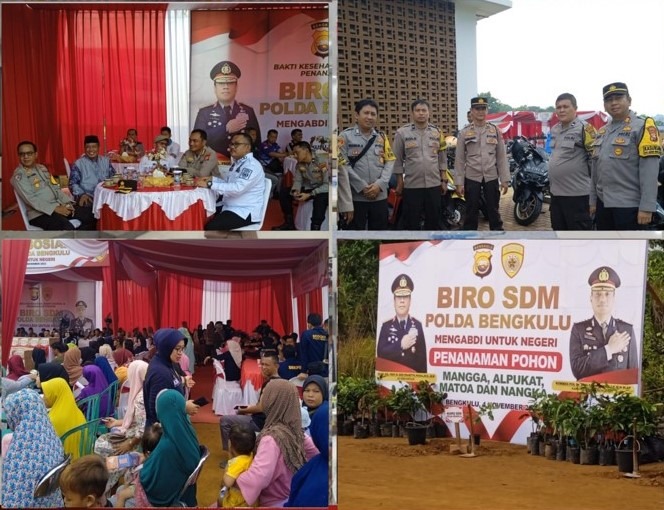 Dalam kegiatan Bakti Sosial tersebut Biro SDM Polda Bengkulu memberikan Bantuan berupa Paket sembako kepada perwakilan warga Sekitar sekaligus penanaman pohon secara simbolis yang di pimpin langsung oleh Karo SDM Polda Bengkulu Kombes Pol. Arif Fajarudin,S.I.K., M.H., M.AP.