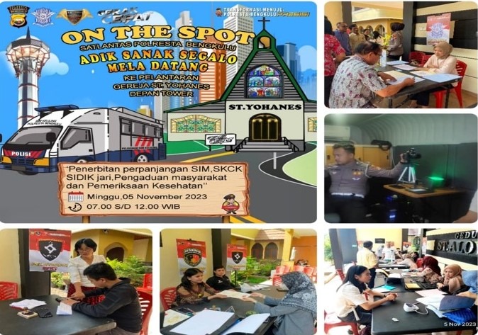 Bengkulu – Dalam upaya memberikan pelayanan prima kepada warga masyarakat Kota Bengkulu, Polresta Bengkulu Polda Bengkulu berikan pelayanan One The Spot Polresta di Gedung Serbaguna ST. Aloysius Gereja Santo Yohanes Kelurahan Berkas Kecamatan Teluk Segara Kota Bengkulu, Minggu (05/11/2023).
