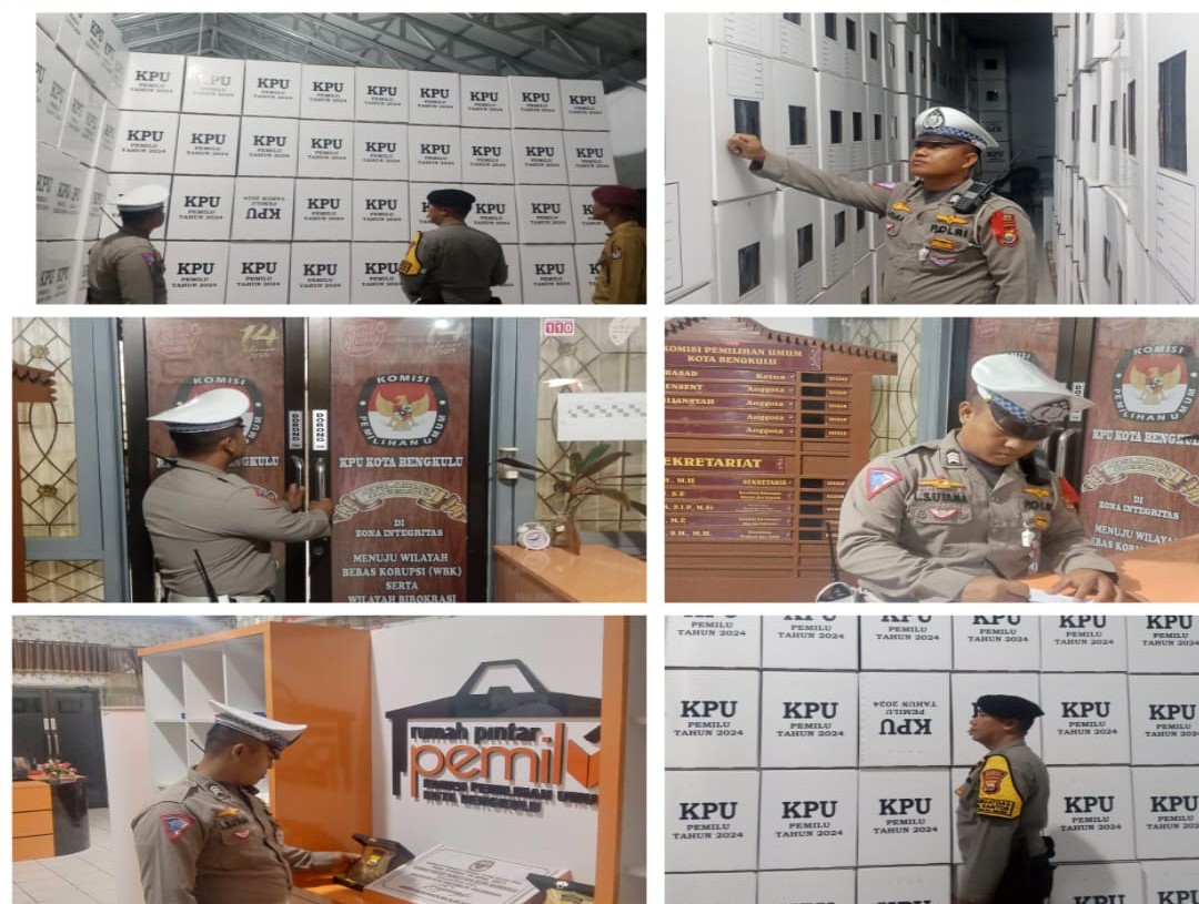 Bengkulu – Rabu, (08/11/2023) Pukul. 21.00 WIB s/d selesai, Personel Subsatgas OMB (Operasi Mantap Brata) Polresta Bengkulu, Ipda A Jauhari, Aiptu J Sembiring, Aipda Andy S, Brigpol Liga S Utama, Briptu Decky Dwi Fernando dan Briptu Arya Bakti melaksanakan patroli pengecekan dan kontrol diseputaran kantor KPU Kota Bengkulu.