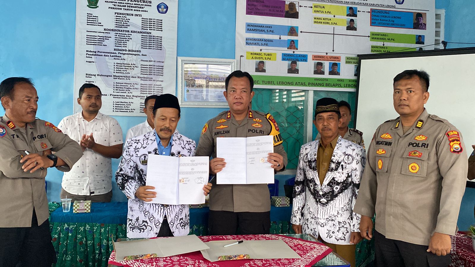 Hadir langsung menandatangani MoU, Kapolres Lebong Polda Bengkulu AKBP Awilzan, S.I.K., bersama Ketua PGRI Lebong Karso, S.Pd, juga Kadis Dikbud Lebong, Elpian Komar, S.Pd., para PJU Polres Lebong, dan pengurus PGRI Lebong, serta para Kapolsek jajaran.