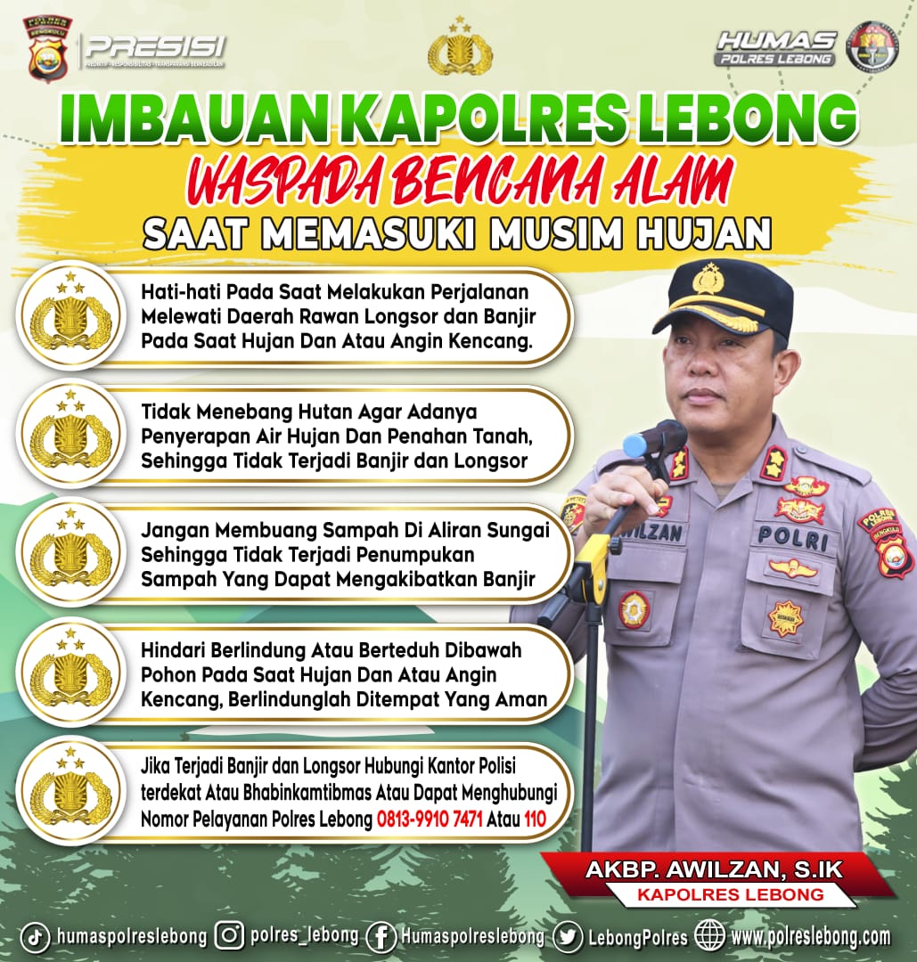 Lebong – Kapolres Lebong Polda Bengkulu AKBP Awilzan, S.I.K., mengimbau warga Kabupaten Lebong meningkatkan kewaspadaan terhadap bencana alam saat memasuki musim hujan.