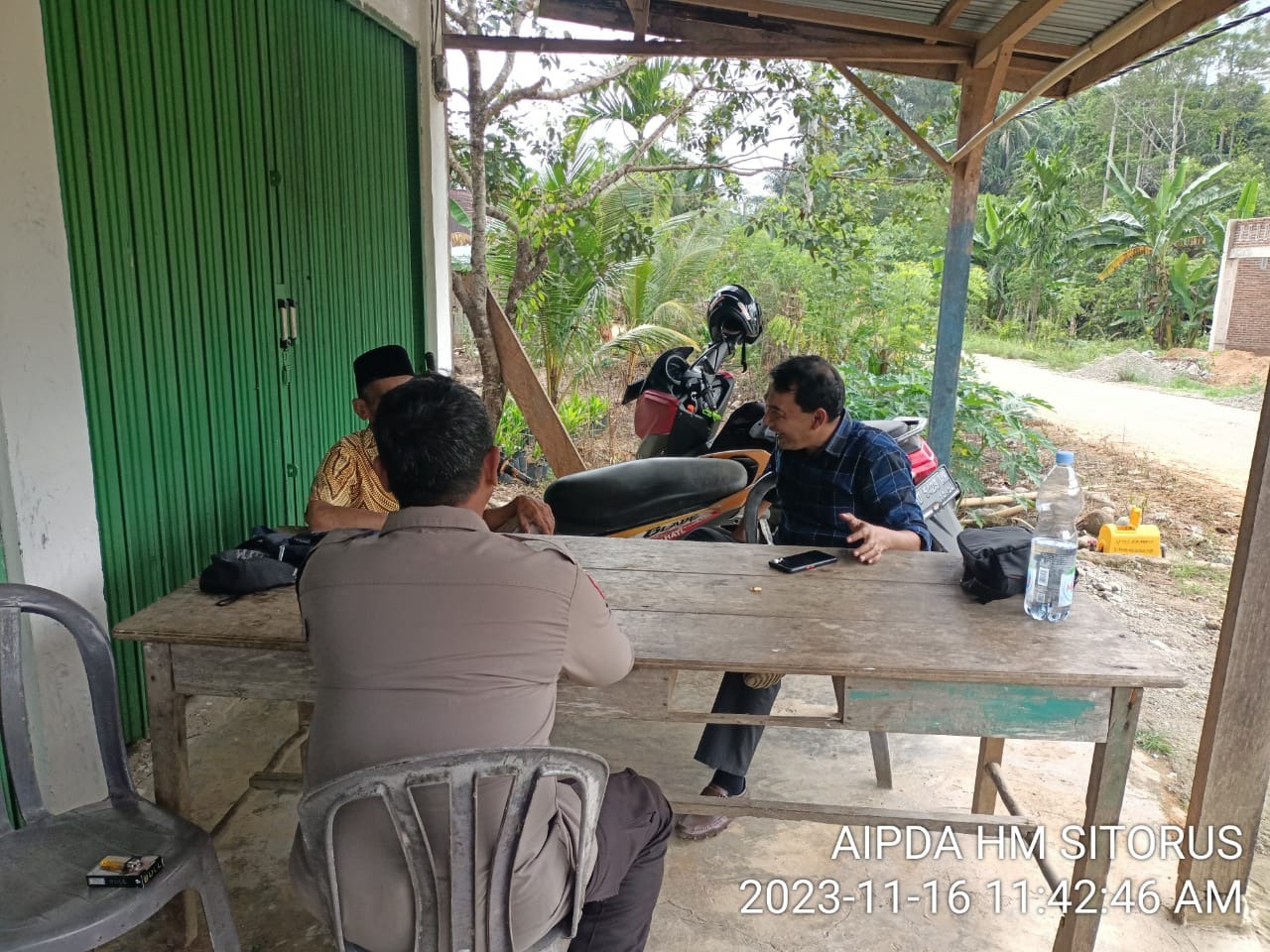 Kaur – Pukul 11.50 WIB Personel Polsek Muara Sahung Polres Kaur Polda Bengkulu, Aipda Edi Sembiring bserserta Bhabinkamtibmas Aipda HM. Sitorus melaksanakan patroli sambang di Desa Ulak Bandung Kecamatan Muara Sahung Kabupaten Kaur, Kamis (16/11/2023).