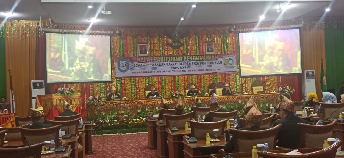 Bengkulu, Tintabangsa.com – Dewan Perwakilan Rakyat Daerah (DPRD) Provinsi Bengkulu gelar apat Paripurna dalam rangka memperingati Hari Ulang Tahun (HUT) Provinsi Bengkulu ke-55 tahun 2023 di gedung DPRD Provinsi Bengkulu, Sabtu (18/11/2023). Rapat ini dipimpin langsung oleh Ketua DPRD Provinsi Bengkulu Ihsan Fajri.