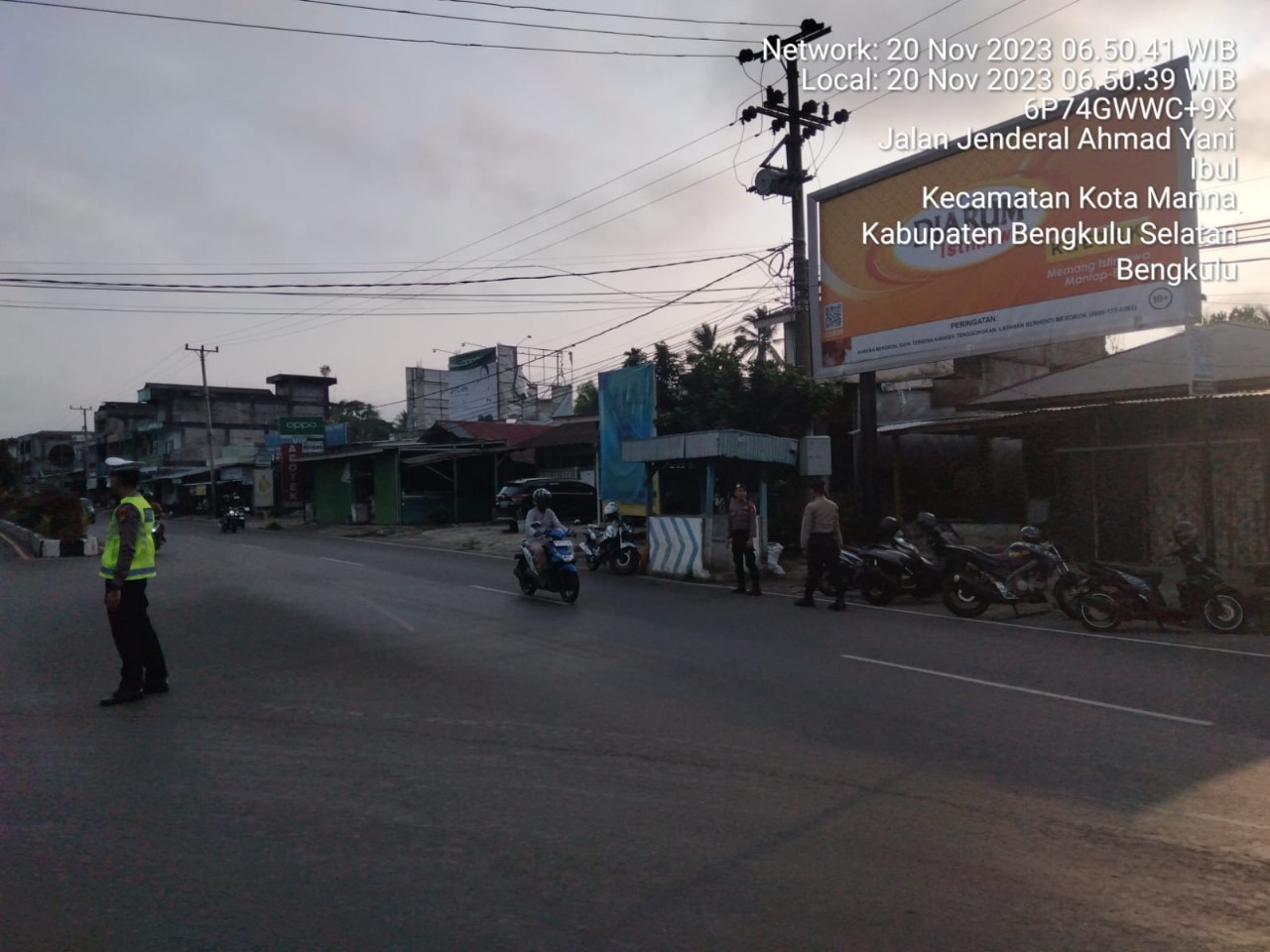 Bengkulu Selatan – Polres Bengkulu Selatan Polda Bengkulu gelar gatur lalin pagi pada hari Selasa (21/11)  mulai pukul 06.30 hingga 07.30 WIB, di wilayah hukum Polsek Kota Manna Polres Bengkulu Selatan, kegiatan ini dilaksanakan di persimpangan rawan kemacetan dan titik-titik kepadatan/kemacetan kendaraan.