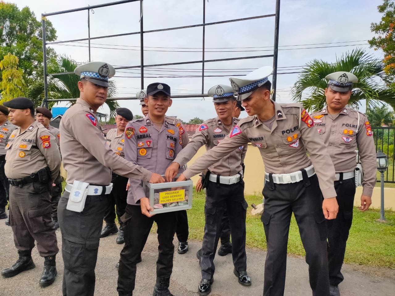 Seluma – Polres Seluma Polda Bengkulu, melaksanaan giat rutin Program Seribu Berbagi yang dilaksan pada hari Senin (27/11/2023) dilapangan Polres Seluma pada Apel jam Pimpinan. Disampaikan Kapolres Seluma AKBP Arif Eko Prasetyo, S.I.K., M.H., melalaui Kabag SDM Polres Seluma AKP JD. Tampubolon, SH., dari hasil giat tersebut dikompulir dananya dan akan di salurkan kepada masyarakat Wilkum Polres Seluma yang benar-benar membutuhkan, yang mana penyalurannya disalurkan dalam bentukw paket Sembako. Kgiatan ini juga dilaksanakan oleh Polsek jajaran Polres Seluma, sehingga hasil dari giat tersebut dikumpulkan dan diserahkan kepada Bag SDM Polres Seluma untuk disalurkan ke masyarakat. “Uang yang terkumpul lalu dikompulir dan dijadikan sembako untuk disalurkan kepada masyarakat yang benar-benar membutuhkan, yang mana data masyarakat yang mendapat sembako tersebut didapat dari para Bhabinkamtibmas yang tersebar di Polres Seluma,” jelas Kabag SDM Polres Seluma AKP JD. Tampubolon, S.H., selaku pelaksana giat 1000 Berbagi. “Kami berharap Sembako yang kami salurkan ini bisa membantu dan berguna bagi masyarakat,” tambah Kabag SDM.