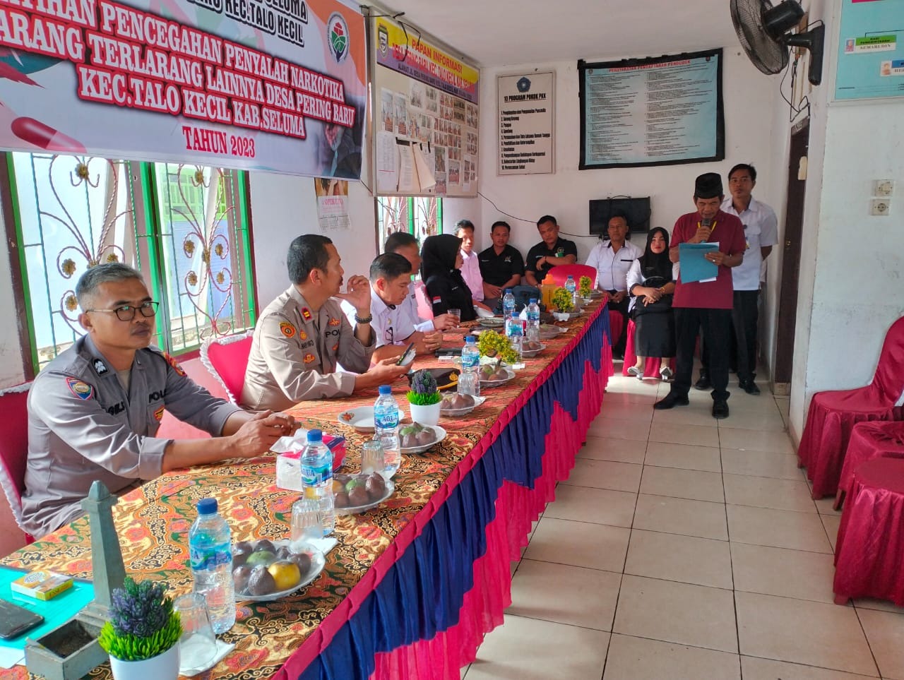 Seluma – Personel Polsek Talo Polres Seluma Polda Bengkulu, dipimpin oleh Kapolsek Talo Iptu M. Haryanto, S, Sos didampingi Camat Talo Kecil dan Aiptu Agik Sunaryo, S.H., menjadi narasumber Sosialisasi hukum tentang bahaya narkoba dan UU perlindungan anak di Balai desa Pring Baru kecamatan Talo Kecil Kabupaten Seluma, Pada hari Rabu, (28/11/2023) sekira 09.00 WIB s/d Selesai.