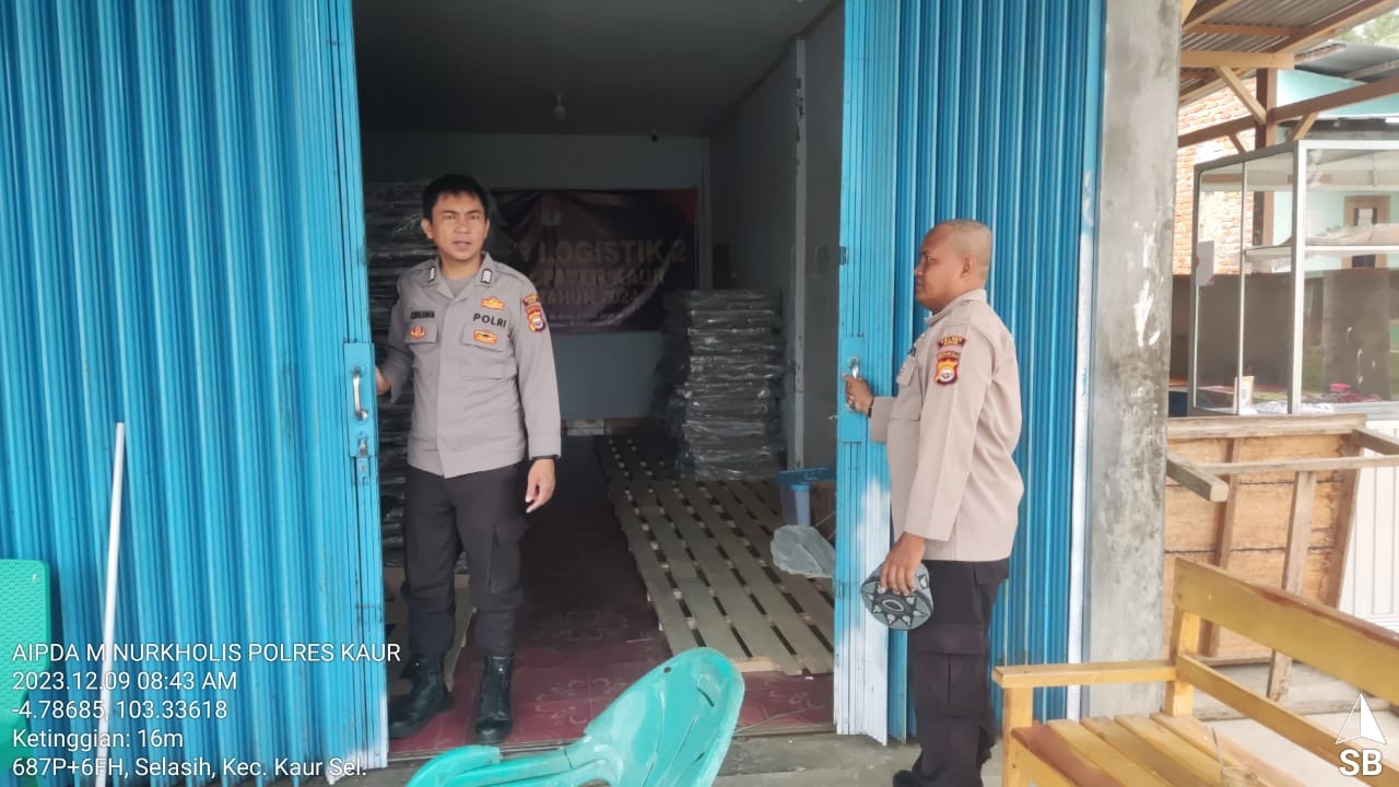 Kaur – Personel piket Satgas Preventif Operasi OMB Polres Kaur Polda Bengkulu, melakukan kegiatan Sistem Pengamanan di gudang Logistik 1,2, dan 3 KPU Kabupaten Kaur, Sabtu (10/12/2023).