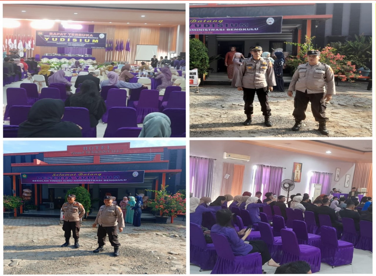 Bengkulu – Bertempat di Hotel Grand Bougenville Jalan Pariwisata Pantai Panjang Kelurahan Lempuing Kecamatan Ratu Agung Kota Bengkulu, Personel Polsek Ratu Agung Polresta Bengkulu Lakukan pengamanan kegiatan rapat terbuka yudisium STIA Bengkulu, Kamis (14/12/2023).
