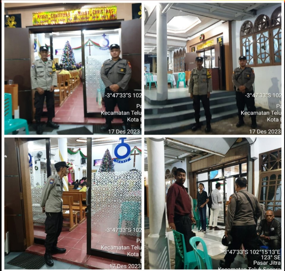 Bengkulu – Minggu (17/12/2023) Polsek Teluk Segara Polresa Bengkulu melakukan pengamanan dan monitoring pelaksanaan ibadah menyambut Natal 2023 di Gereja HKBP (Huria Kristen Batak Protestan) jalan Veteran Kel.Jitra Kec.Teluk Segara Kec.Teluk Segara Kota Bengkulu. Kegiatan pengamanan dan monitoring ini dipimpin oleh Kapolsek Teluk Segara Kompol Irzal, S.H., dan diikuti personel Aipda Sigit R, Brigpol Nuril, dan Briptu Meri. Disampaikan Kapolresta Bengkulu Kombes Pol Aris Sulistiyono melalui Kapolsek Teluk Segara monitoring tersebut bertujuan untuk memastikan kegiatan peribadatan perayaan Natal sudah berjalan dengan baik. “Kita memantau dan melihat langsung, lanjutnya, untuk memastikan kapasitas dan jumlah jemaat gerejanya sudah sesuai apa belum, tapi seperti yang kita lihat bersama semua sudah sesuai dan sistem pengamanannya juga sudah baik, ini semua untuk mengantisipasi agar tidak terjadi hal-hal yang tidak kita inginkan,” imbuhnya.