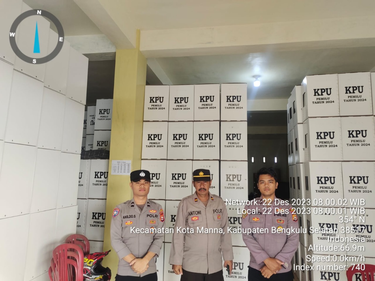 Kapolres Bengkulu Selatan AKBP Florentus Situngkir S.I.K., melalui Karendalops AKP Andri Anwar S.H., M.M., mengatakan setiap harinya personel PAM ditugaskan di Gudang Logistik KPU Kab. Bengkulu Selatan melakukan pengamanan dengan penuh kewaspadaan.