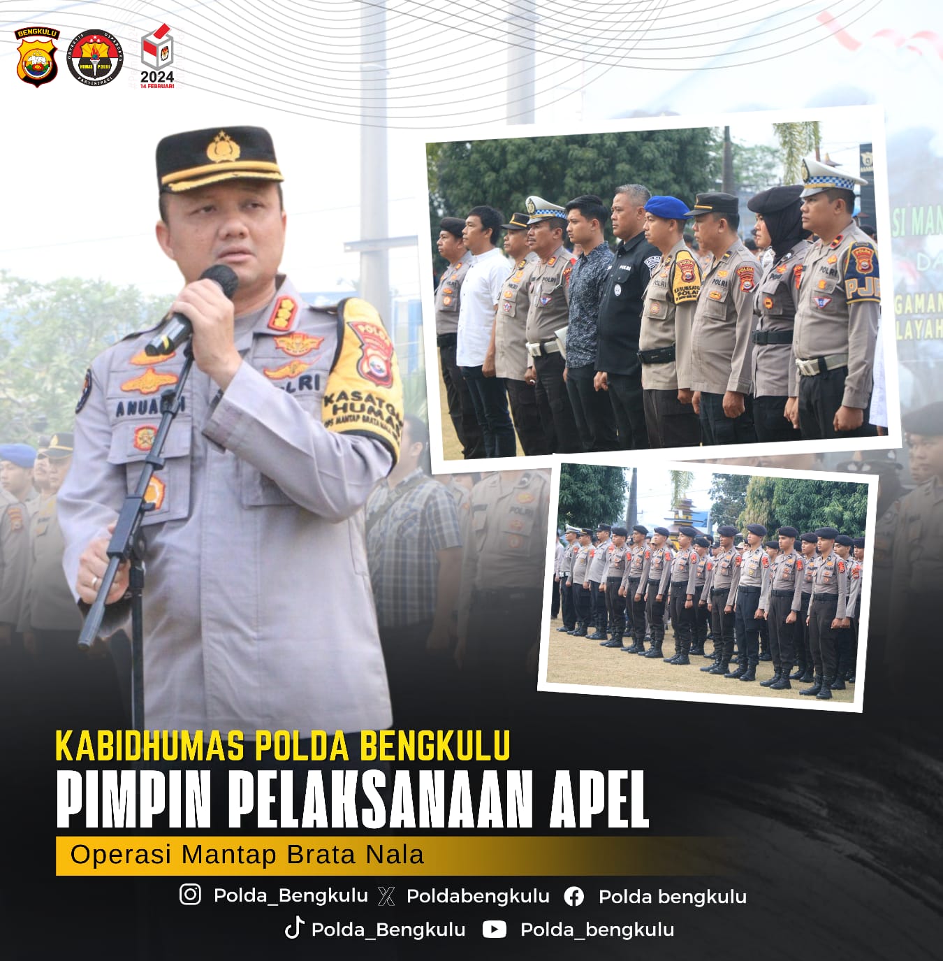 Bengkulu – Kabid Humas Polda Bengkulu Kombespol Anuardi S.Ik., M.Si., CPHR memimpin Apel Rutin dalam rangka Operasi Mantap Brata Nala 2023-2024 di Lapangan depan Mapolda Bengkulu, Rabu (27/12/23).