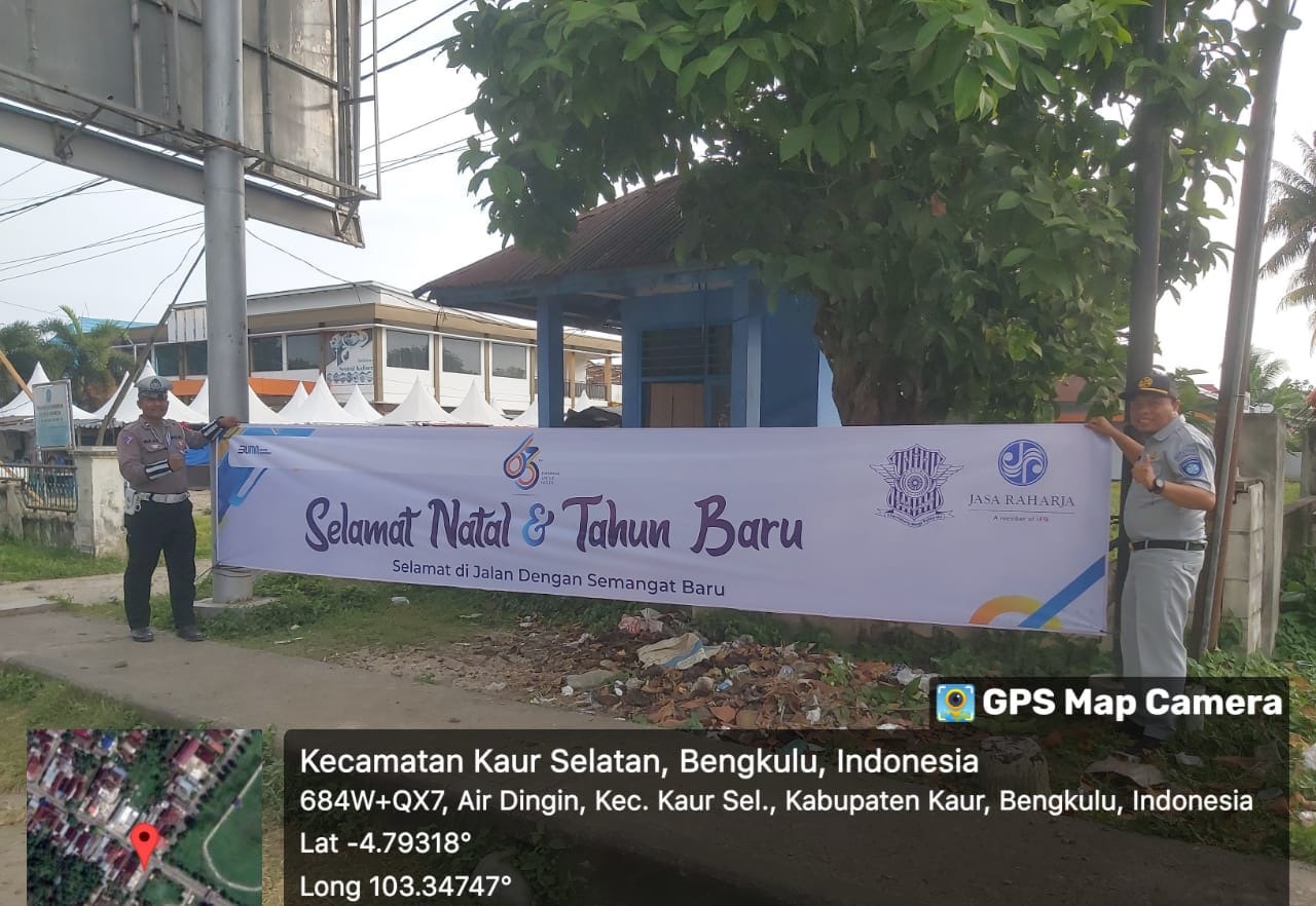 Kaur – Satgas Kamseltibcar lantas Polres Kaur Polda Bengkulu bersama dengan pihak Jasa Raharja melakukan pemasangan Spanduk ucapan Selamat Natal dan Tahun Baru, Jumat, (29/12/2023), Pukul 10.00 WIB s/d 10.30 WIB.