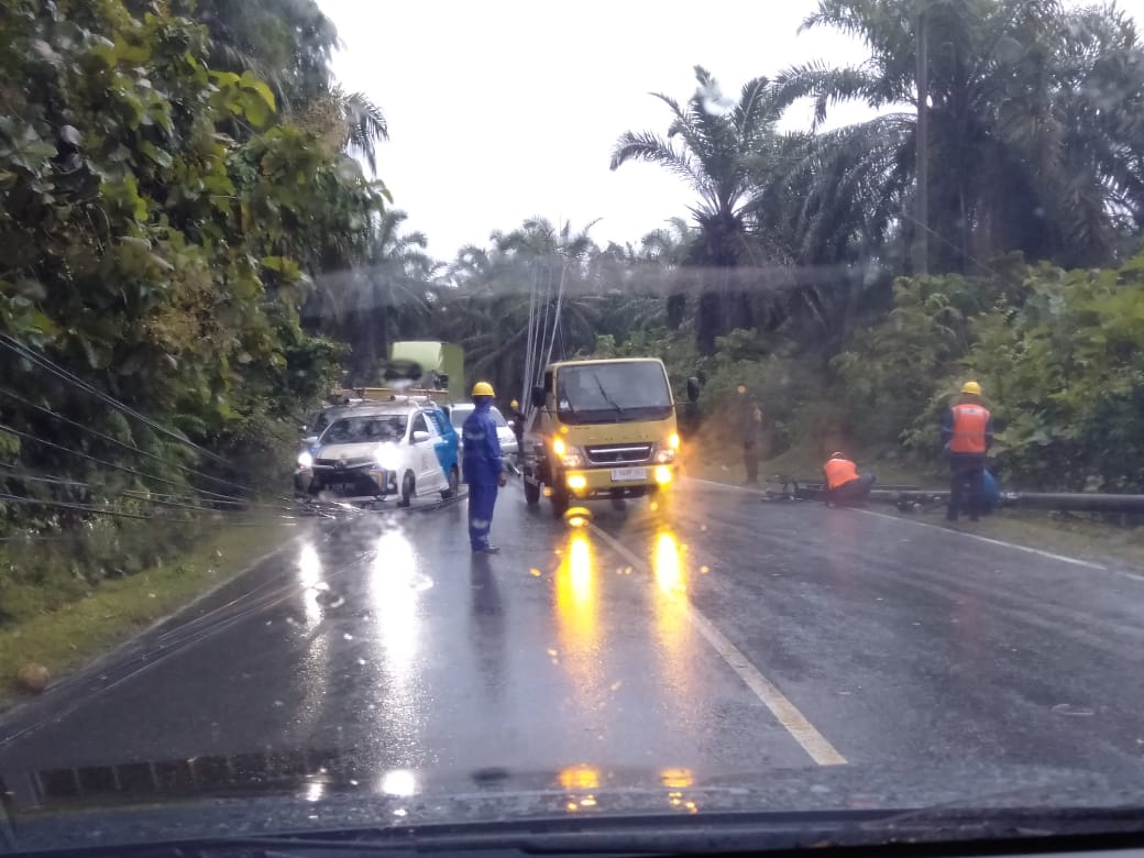 “Terlihat tiang listrik yang roboh ke jalan lagi proses dipinggirkan karena mengganggu lalu lintas. Kabel listrik juga melintang ke jalan. Untuk itu kita harus bersabar,” ujar Kapolsek.