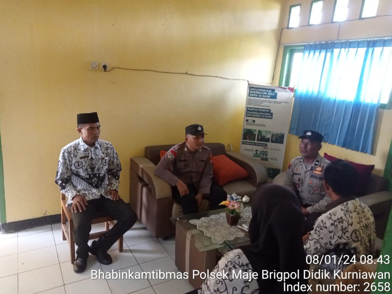melaksanakan Police Go To School di SNPN 16 Kaur di Kecamatan Maje Kabupaten Kaur Senin, (08/01/2024) Sekira pukul 08.00 WIB.Kapolres Kaur AKBP H. Eko Budiman, S.IK M.I.K M.Si menyampaikan Police Goes To School menjadi pilihan tepat untuk mensosialisasikan dampak negatif yang terjadi akibat dari kenakalan remaja tersebut. Gerakan ini rutin dilakukan, hal ini sebagai upaya untuk meminimalisir kenakalan remaja. Kapolres menyampaikan, disetiap kesempatan saat berkunjung ke sekolah, selalu menyampaikan imbauan dan pesan Kamtibmas kepada guru dan pelajar dalam rangka menciptakan Keamanan dan ketertiban di lingkungan sekolah.”Mudah-mudahan gerakan Goes to school ini bisa efektif dalam memberantas kenakalan remaja di Kabupaten Kaur,” jelasnya, Senin (08/01/2024).Kapolres mengajak kepada seluruh lapisan masyarakat khususnya para orang tua untuk terus mengawasi kegiatan dari pada anak-anaknya, sehingga apapun yang dilakukan bisa terus dipantau dan kedepan bisa diarahkan untuk menjadi yang lebih baik.