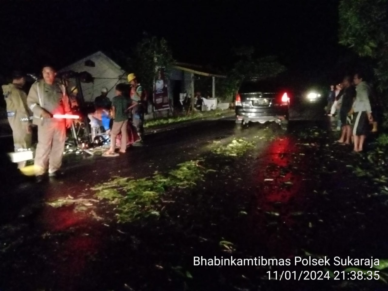 Tiang Listrik Roboh dan Mengganggu Badan Jalan, Personel Polsek Sukaraja Lakukan Pengaturan Lalin