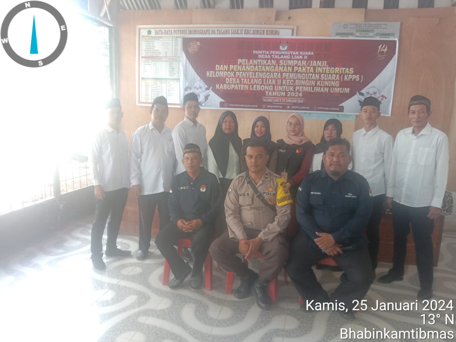 Lebong – Personel Bhabinkamtibmas Polsek Lebong Selatan Polres Lebong Polda Bengkulu, Aipda Eko Supriyanto, menghadiri kegiatan pelantikan Kelompok Penyelenggara Pemungutan Suara (KPPS) di Desa Bungin, Desa Talang Liak I dan Desa Talang Liak II, Kecamatan Bingin Kuning Kabupaten Lebong, Kamis (25/1/2024).