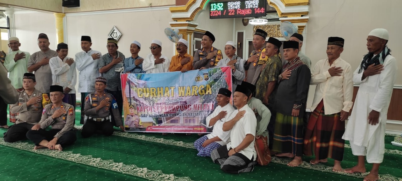 Bengkulu – Dalam rangka menjaring dan menyerap informasi dari warga masyarakat secara langsung dan bertatap muka dengan masyarakat, Kapolresta Bengkulu, Kombes Pol Deddy Nata, S.I.K., kembali menggelar giat Jumat Curhat. Kali ini Jumat Curhat dilakukan bersama Jema’ah Jumat / warga Rt.17 Rw.05 Kel.Sumber Jaya Kecamatan Kampung Melayu Kota Bengkulu, di Masjid Baitul Makmur Jalan Raya Simpang Kandis, Jumat (02/02/2024).