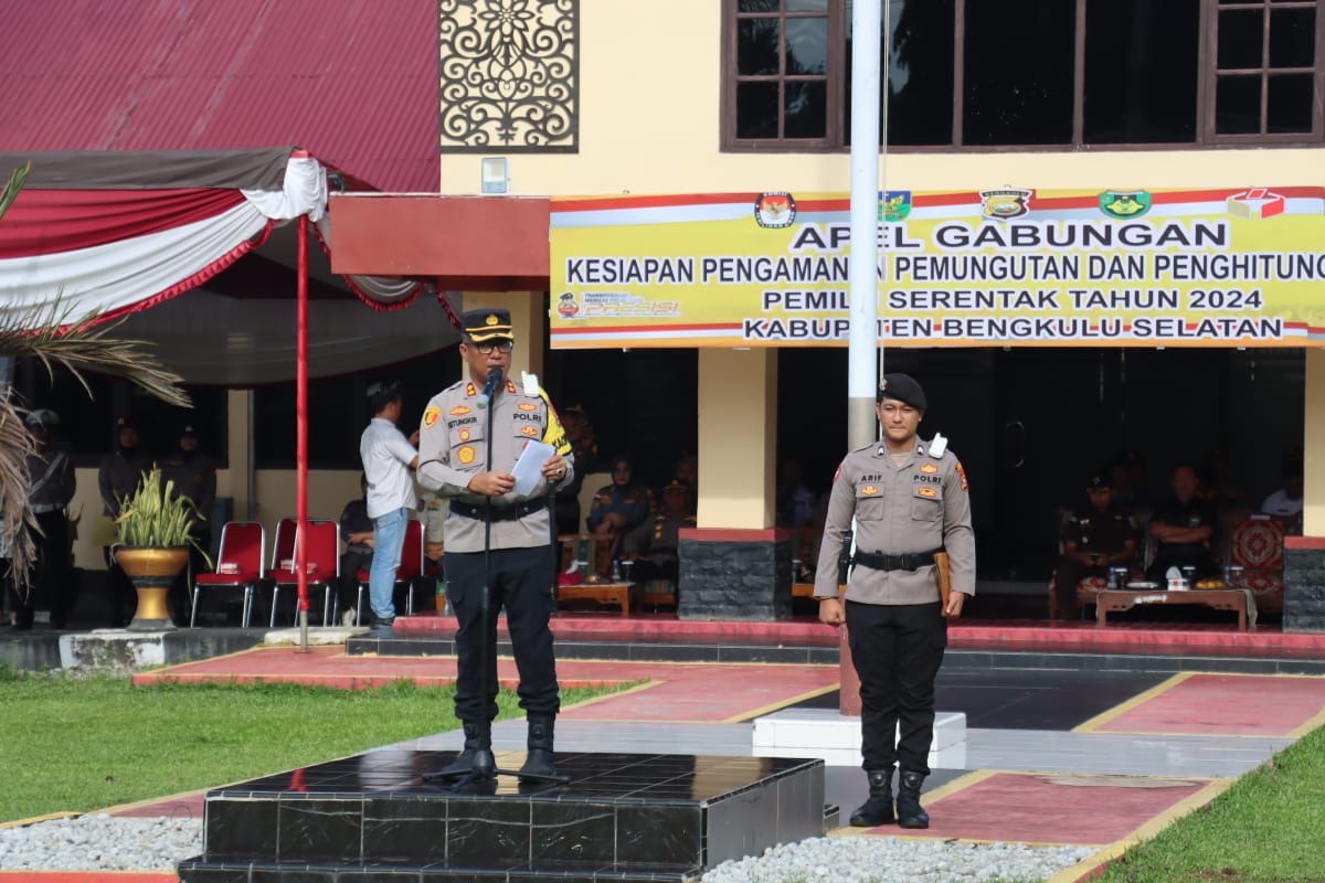 Dalam pelaksanaan Apel gabungan ini yang dipimpin langsung oleh Kapolres Bengkulu Selatan AKBP Florentus Situngkir S.I.K., tampak barisan aparat kepolisian, TNI dan Satpol PP hingga linmas yang telah berkomitmen untuk menjaga keamanan dan ketertiban demi jalannya pelaksanaan pemilihan umum yang akan digelar pada 14 Februari mendatang.